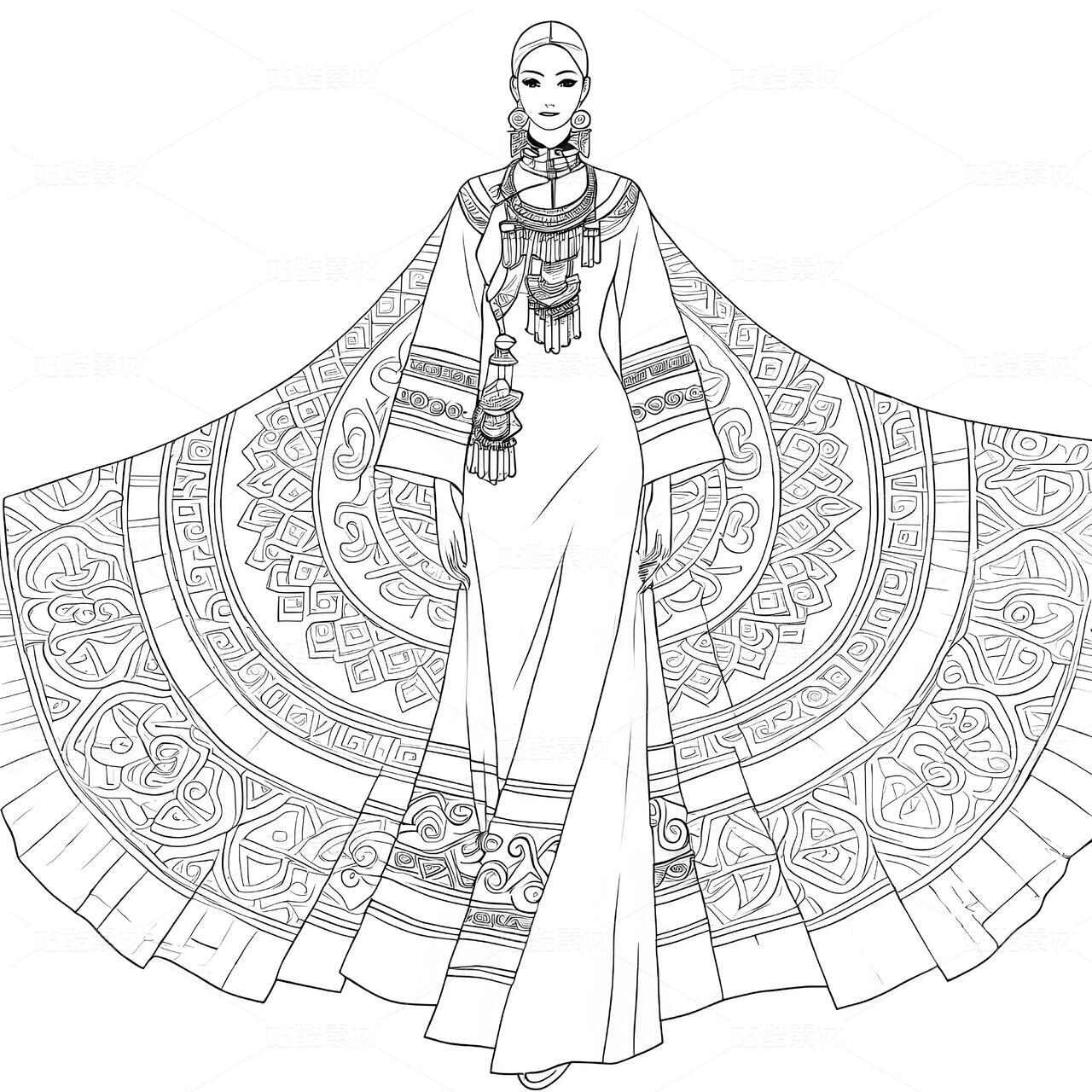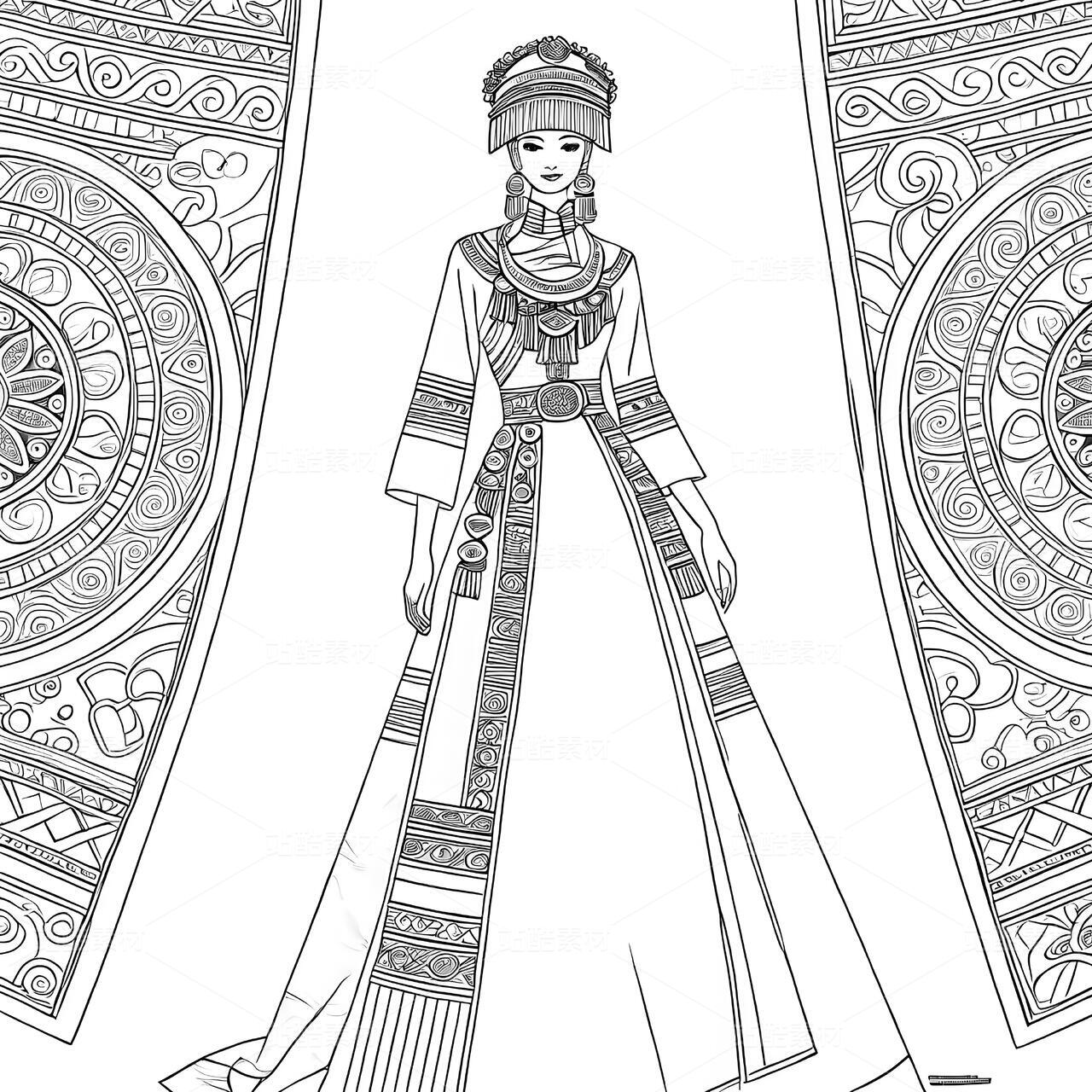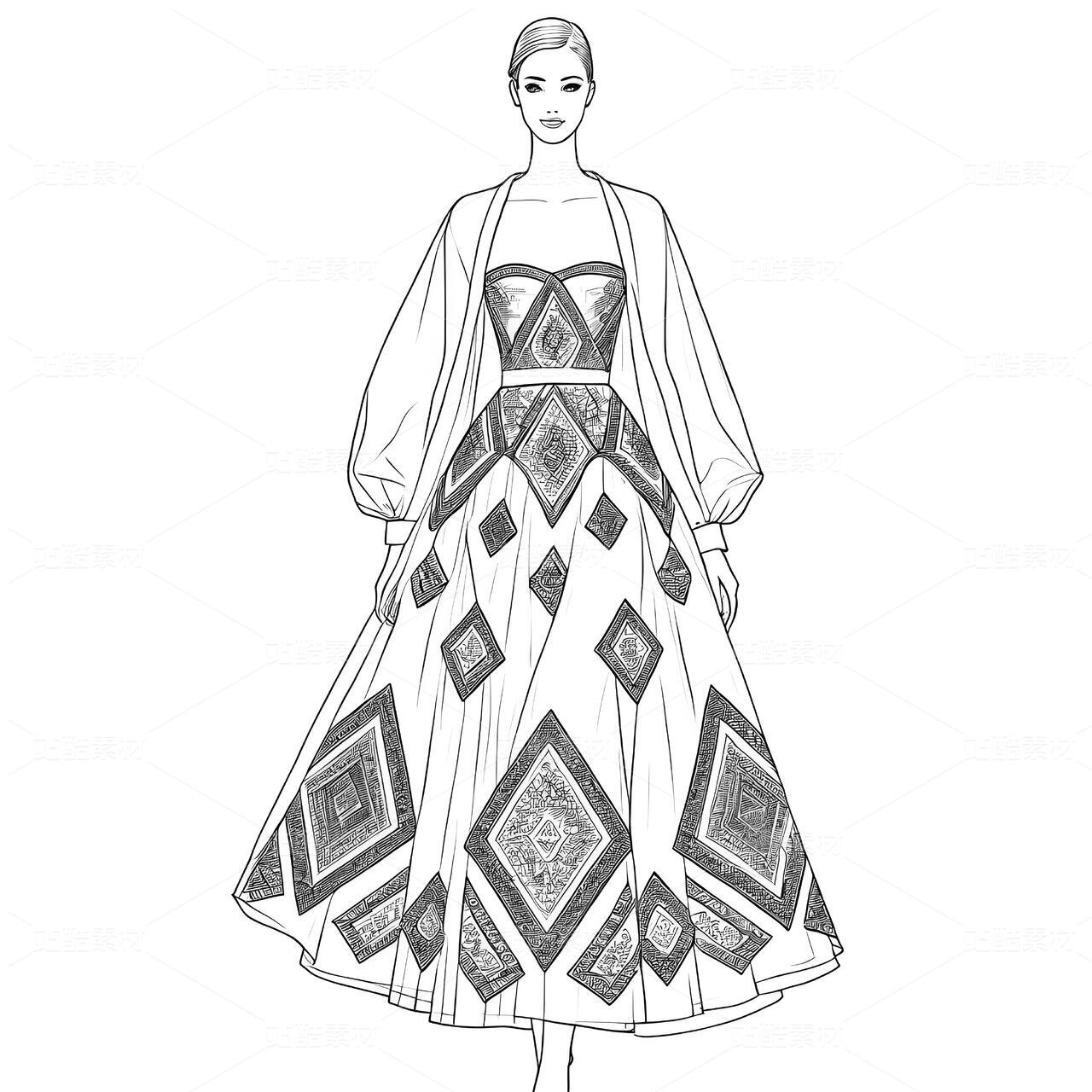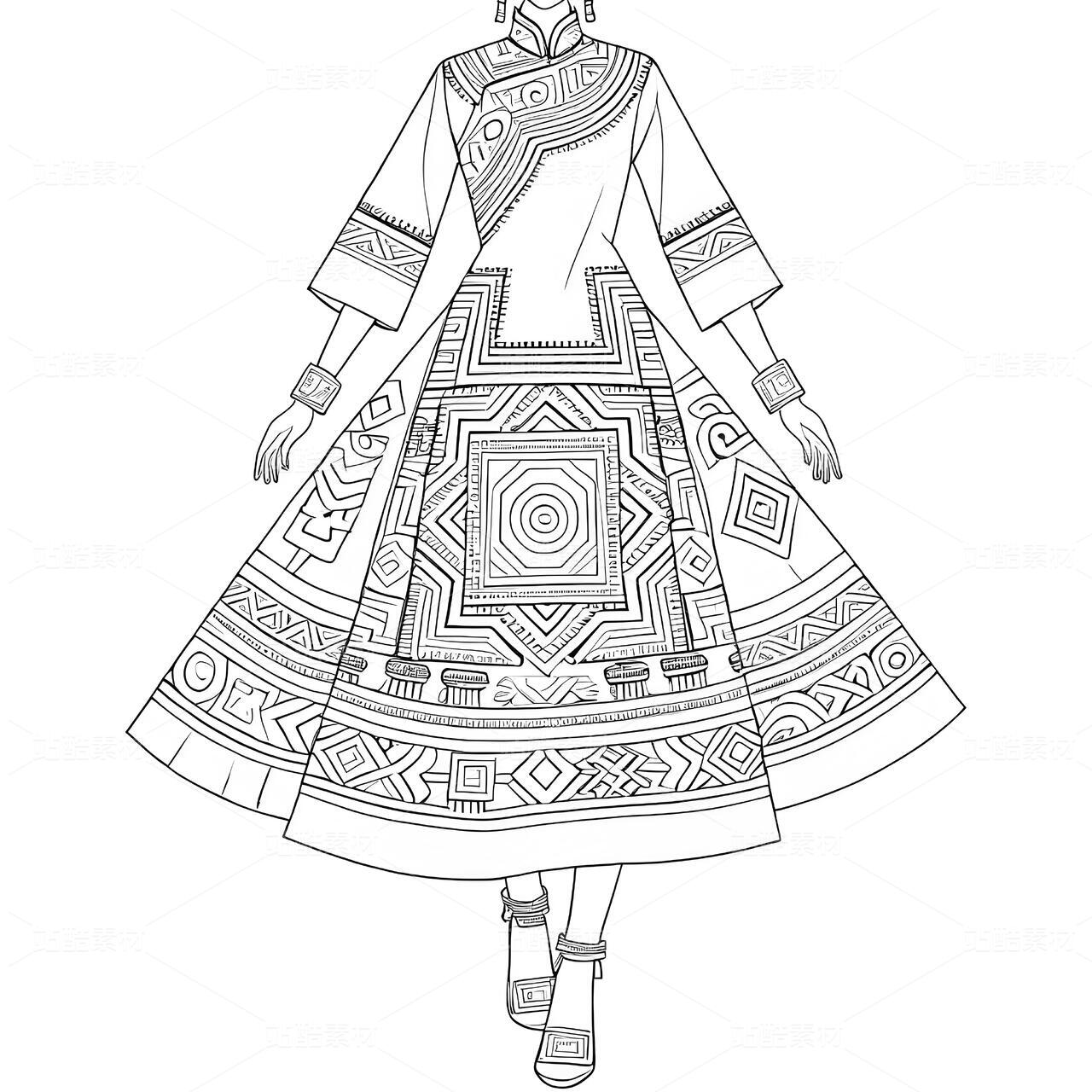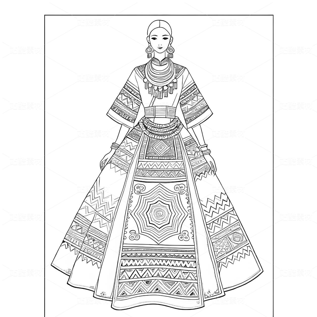 高定苗族蜡染礼服设计手稿正面图,礼服带有苗族特色元素和苗族银饰,以白色背景凸显设计。
