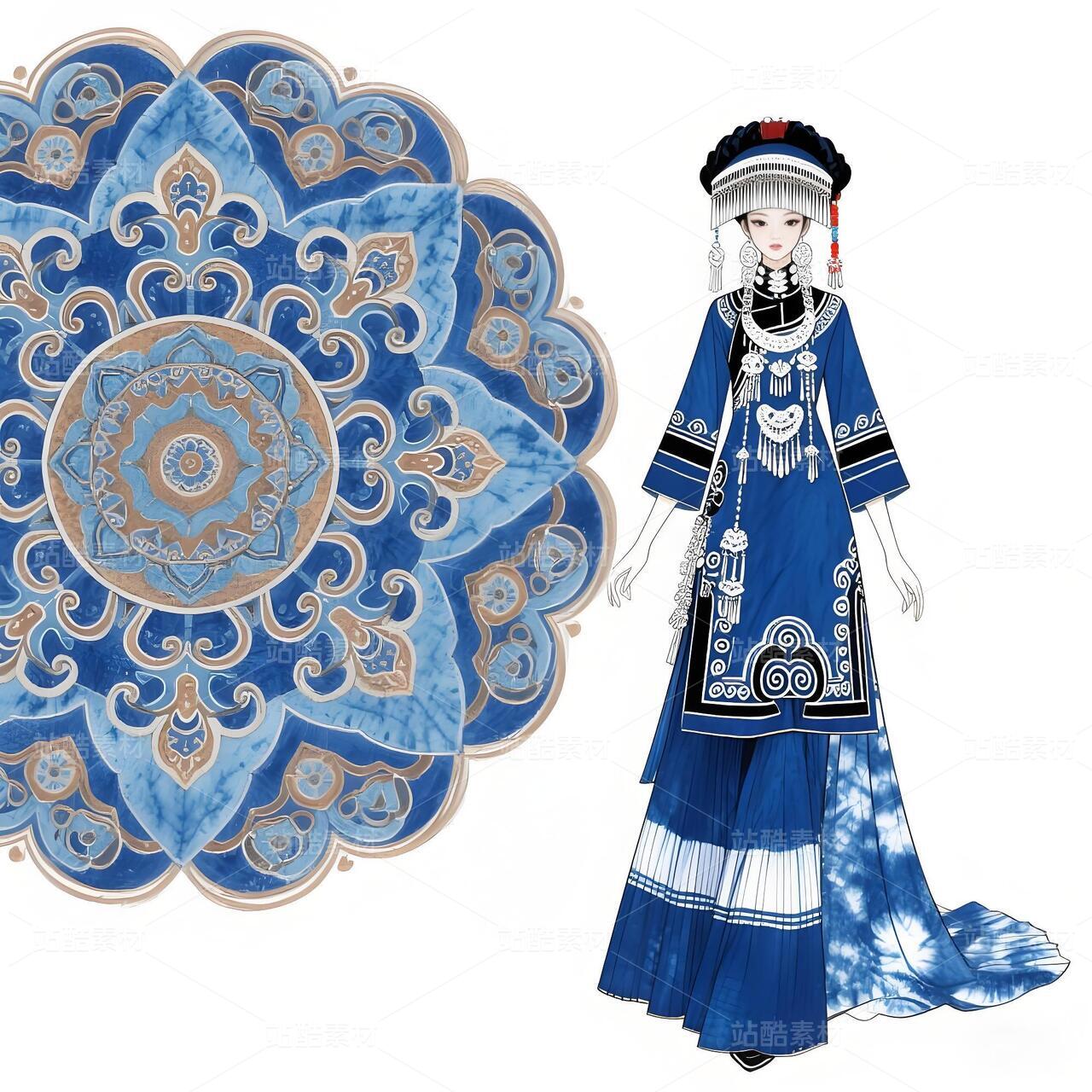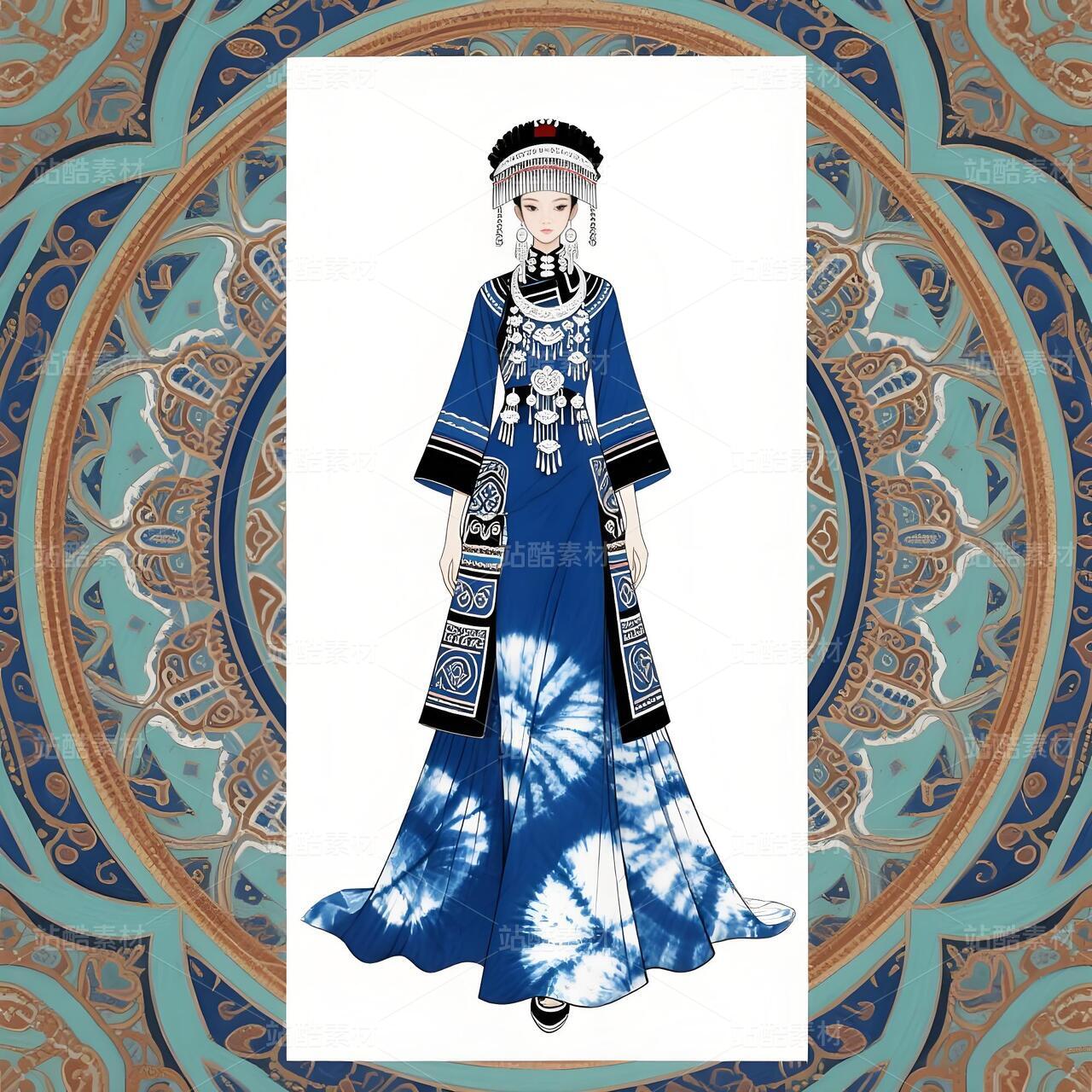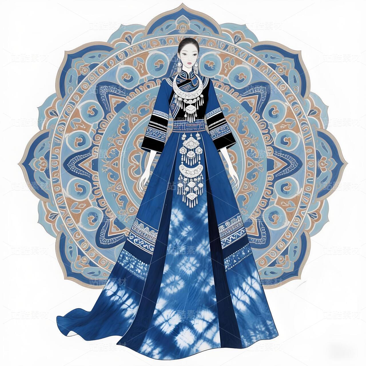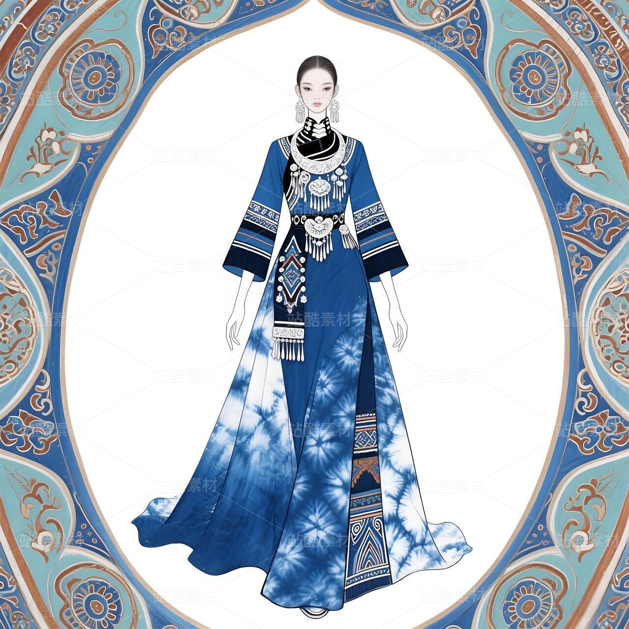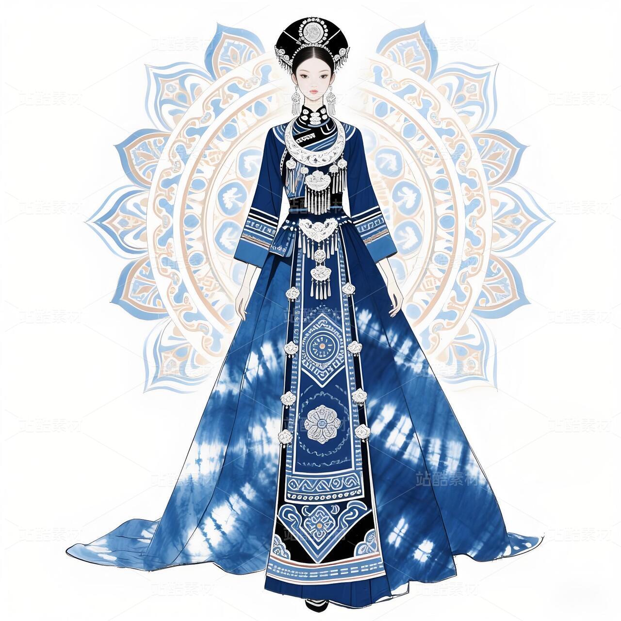 本设计以苗族传统服饰文化为根基,融合敦煌藻井艺术的恢弘美学,打造兼具民族精神与当代审美的礼服作品。主体采用非遗苗族扎染工艺,通过靛蓝渐变晕染形成层叠水波纹,象征苗族依水而居的历史记忆;衣身缀以抽象化藻井莲花纹样,以金线刺绣勾勒出敦煌壁画的华贵韵律。领口、袖缘及腰封处镶嵌苗族錾花银饰,通过冷冽金属光泽与温润靛蓝布料的碰撞,形成传统与现代的时空对话。礼服廓形以苗族百褶裙为基础改良,结合鱼尾式拖摆设计,既保留民族服饰的灵动韵律,又赋予现代高定时装的流畅线条。前襟采用不对称破线设计,隐喻苗族迁徙史诗中的山河脉络。