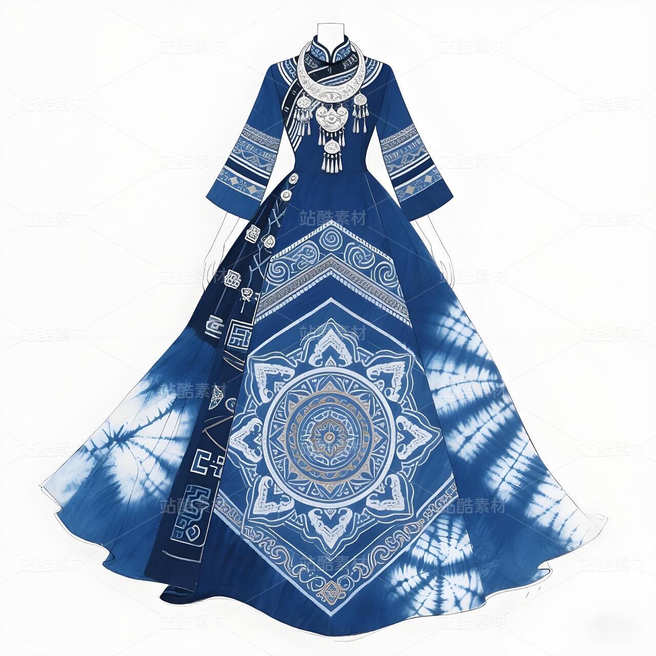 礼服以苗族非遗扎染为灵魂,靛蓝面料经手工折叠浸染,形成层叠水纹与冰裂纹理,呼应敦煌壁画风化质感。衣身以苗族“百鸟衣”图腾为底,叠绣敦煌藻井九宫莲花纹,金线与银丝交织,暗喻丝路文明与苗族神话的千年对话。廓形融合苗族交襟结构与欧式鱼尾剪裁,肩部垂落錾花银饰流苏,腰际缀以银铃链条,碰撞出冷冽金属与深邃靛蓝的视觉张力。前襟斜裁褶皱象征苗疆梯田,裙摆渐层扎染如月下江河,传递“山水入衣”的东方哲思。