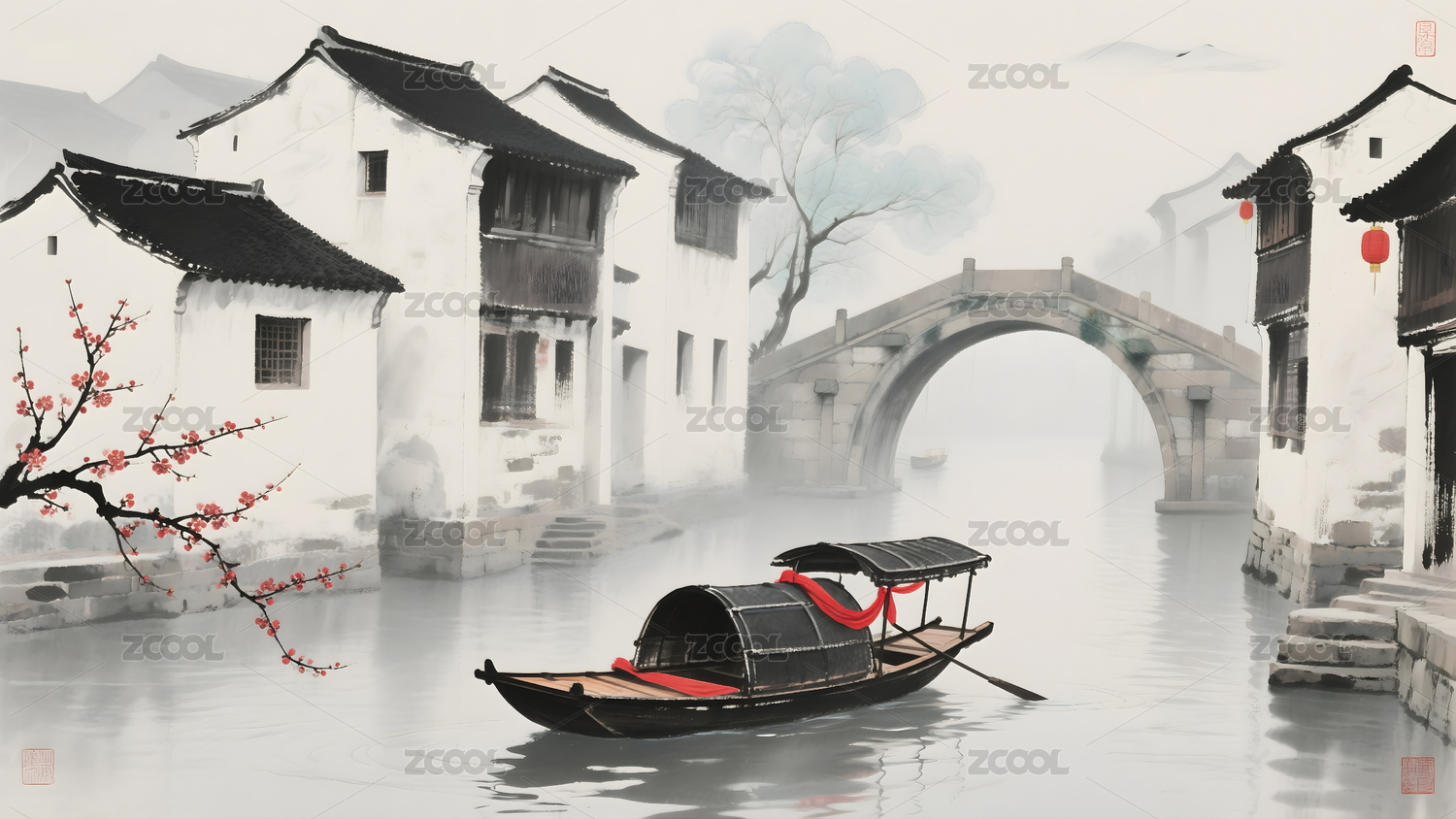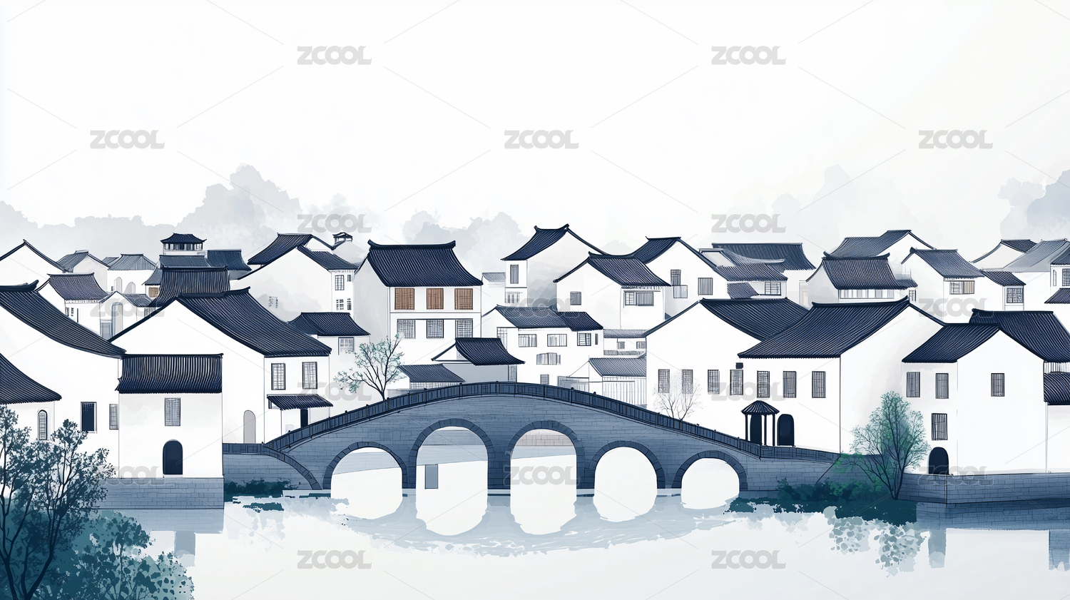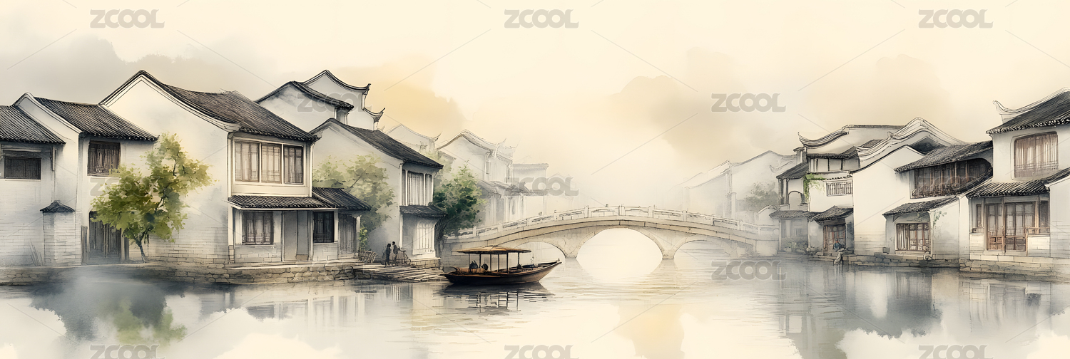 水墨风格古建筑水乡景观