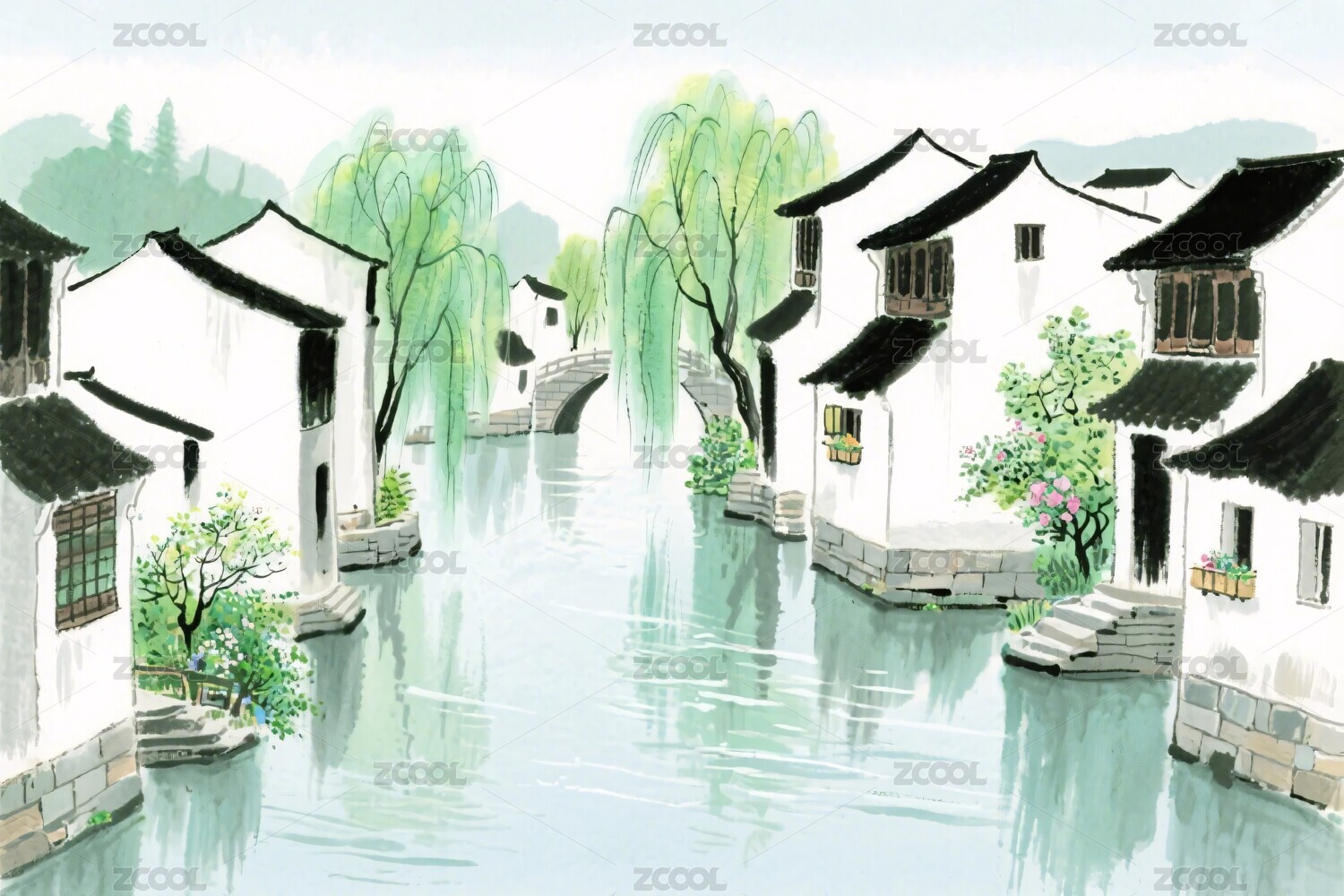 水粉画效果的江南水乡古建筑景观