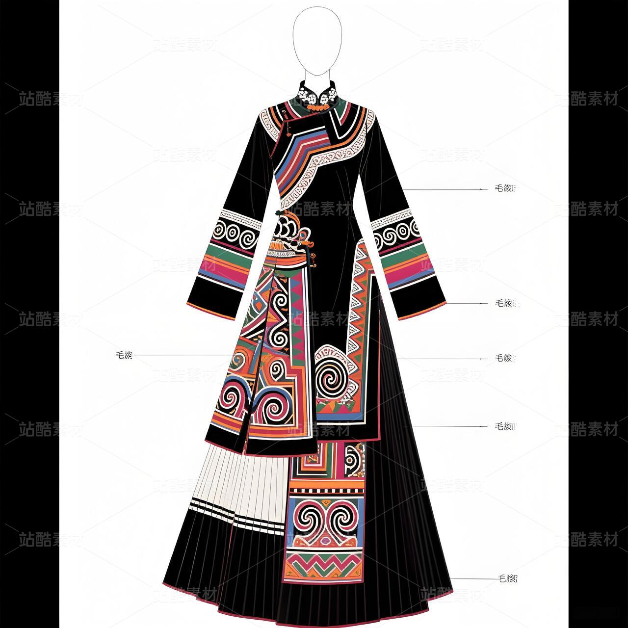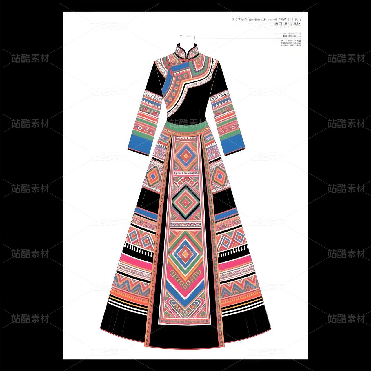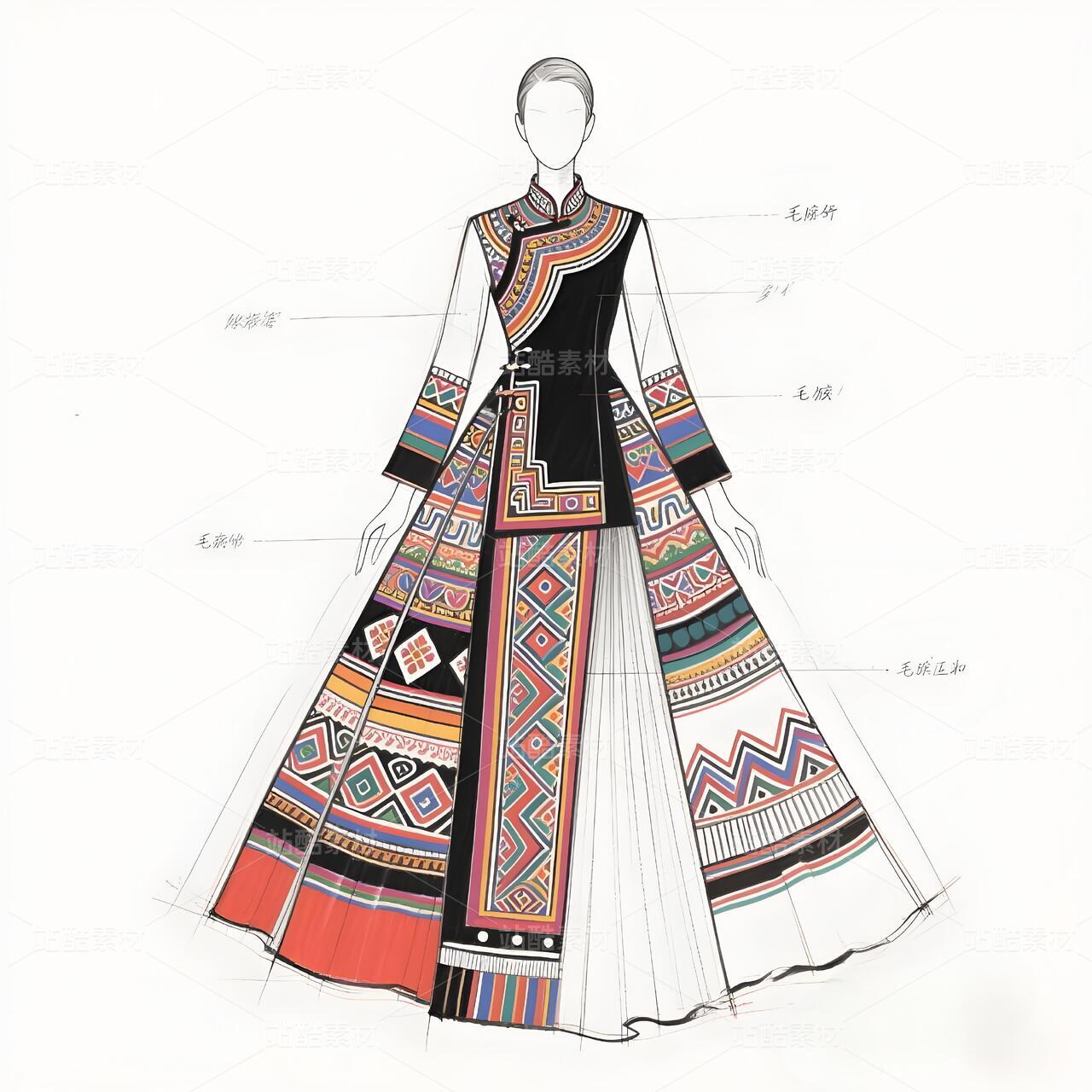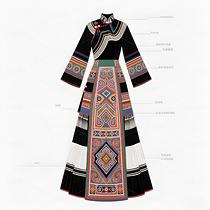 毛南族服饰承载骆越族群千年山居文明,清代《庆远府志》记载"毛南锦"为御贡珍品。纹样体系融合原始宗教"三界观"(天地水)与唐宋汉文化凤凰图腾,织锦技艺列入国家级非遗。本设计解构花竹帽编织逻辑、梯田地貌等文化基因,以高定语言激活濒危手工艺,重塑民族身份认同。