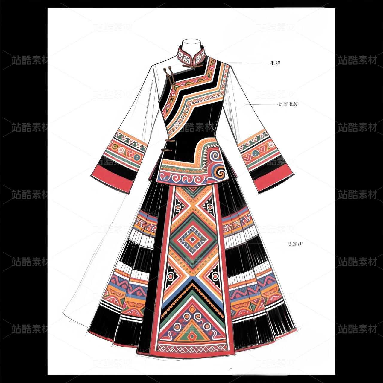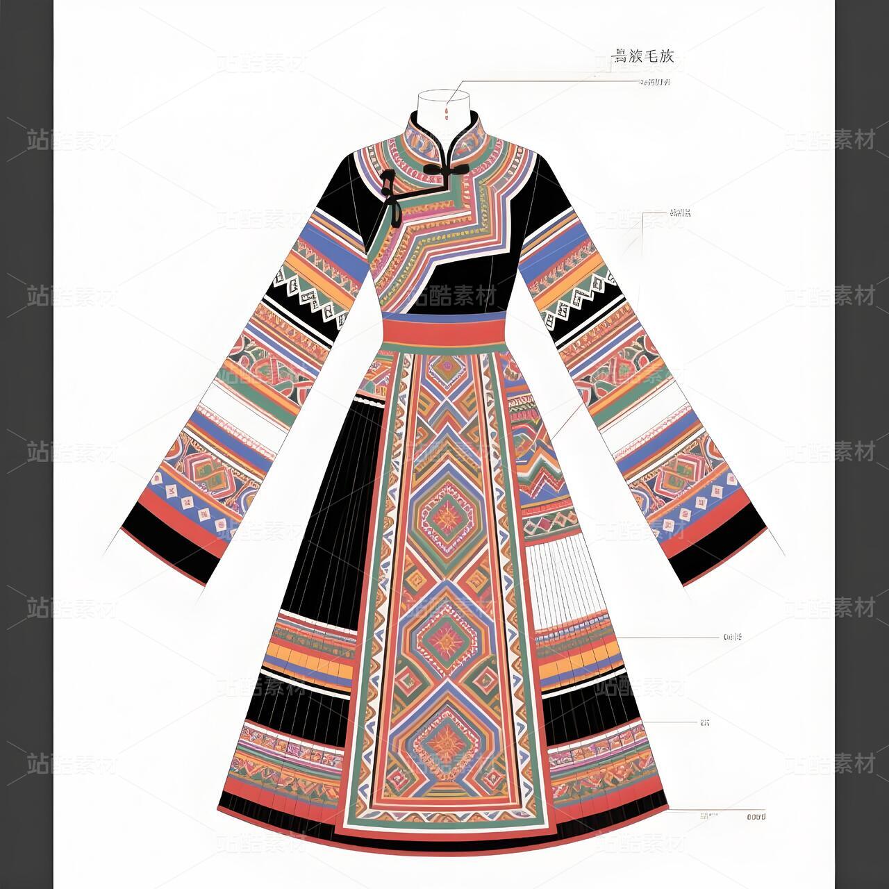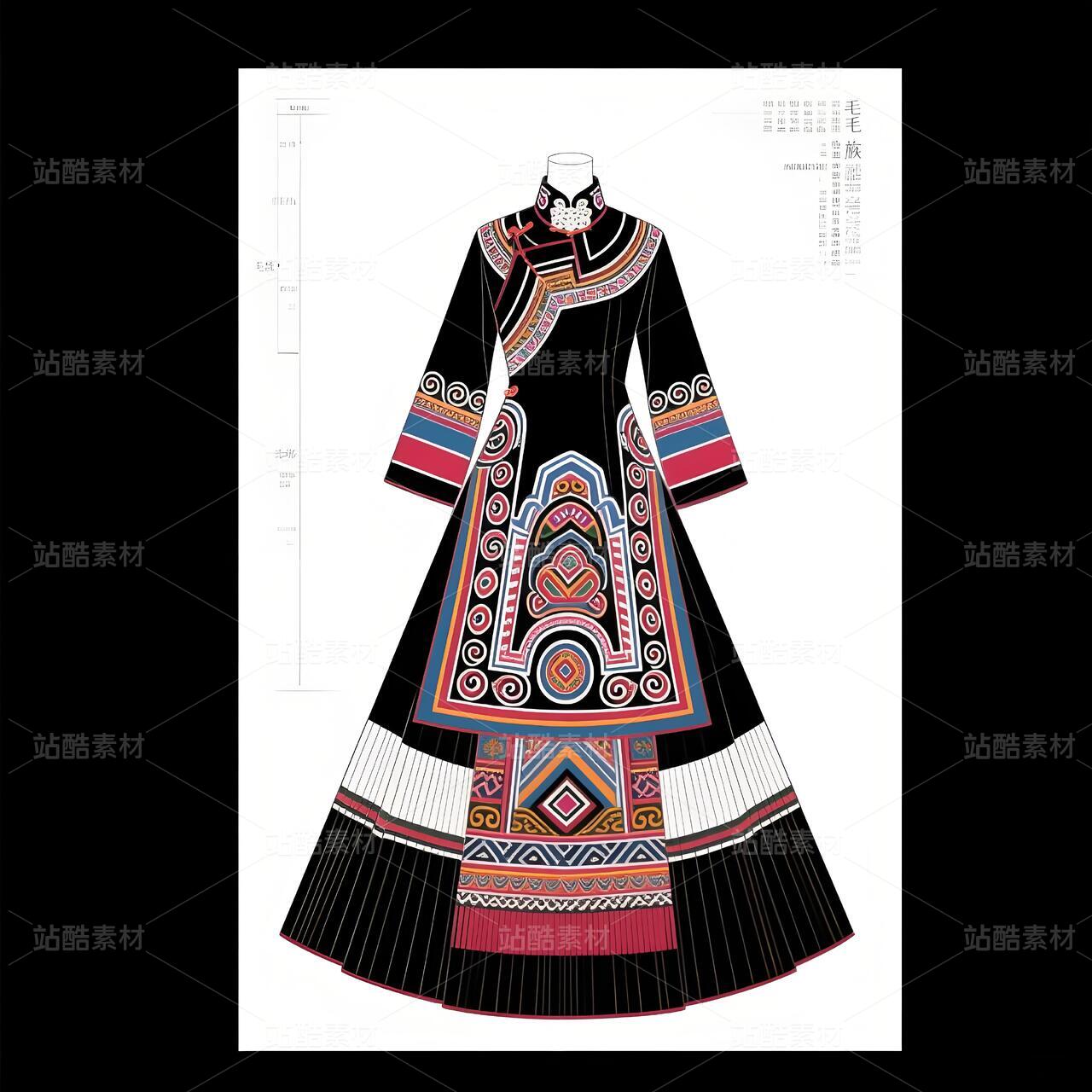 毛南族服饰承载骆越族群千年山居文明,清代《庆远府志》记载"毛南锦"为御贡珍品。纹样体系融合原始宗教"三界观"(天地水)与唐宋汉文化凤凰图腾,织锦技艺列入国家级非遗。本设计解构花竹帽编织逻辑、梯田地貌等文化基因,以高定语言激活濒危手工艺,重塑民族身份认同。