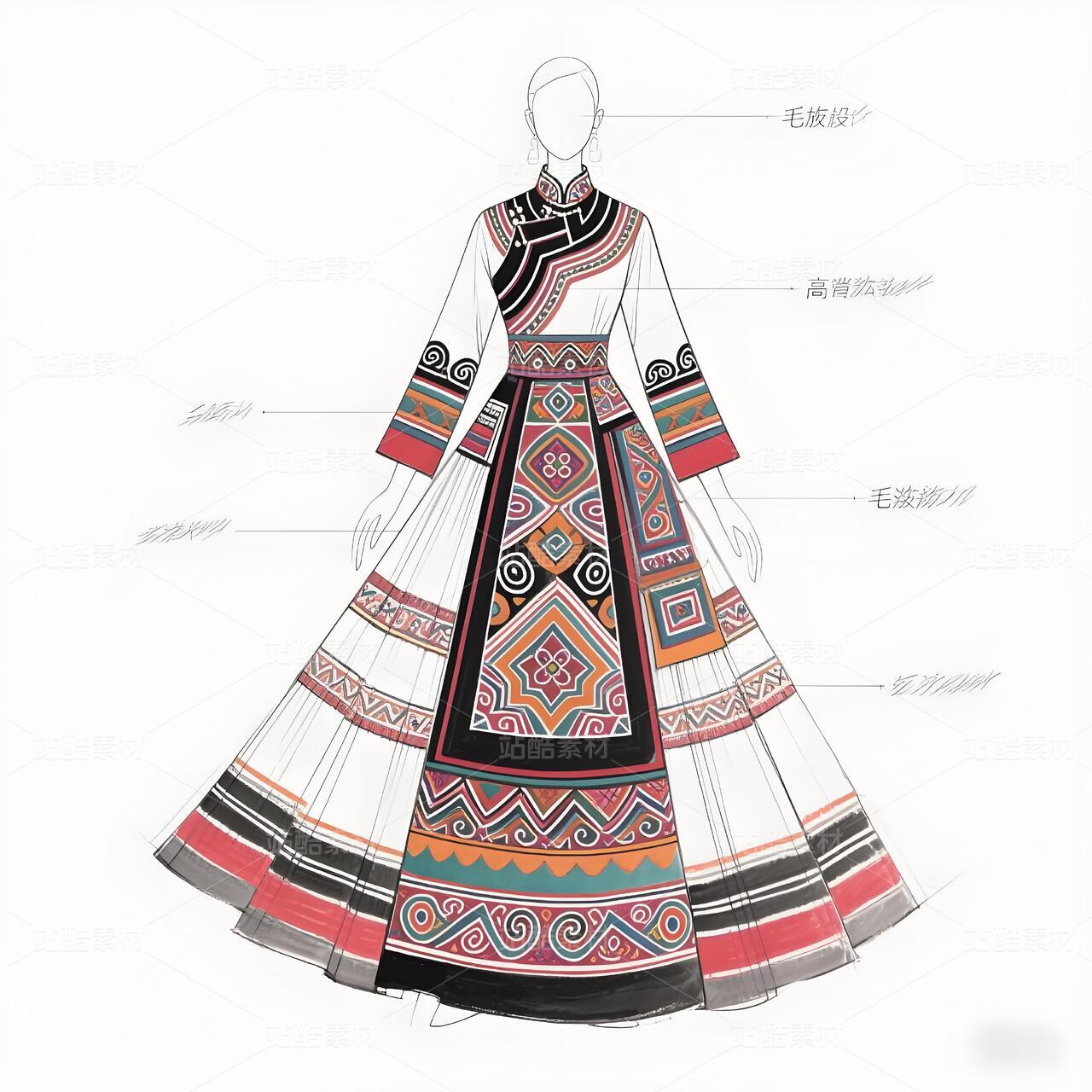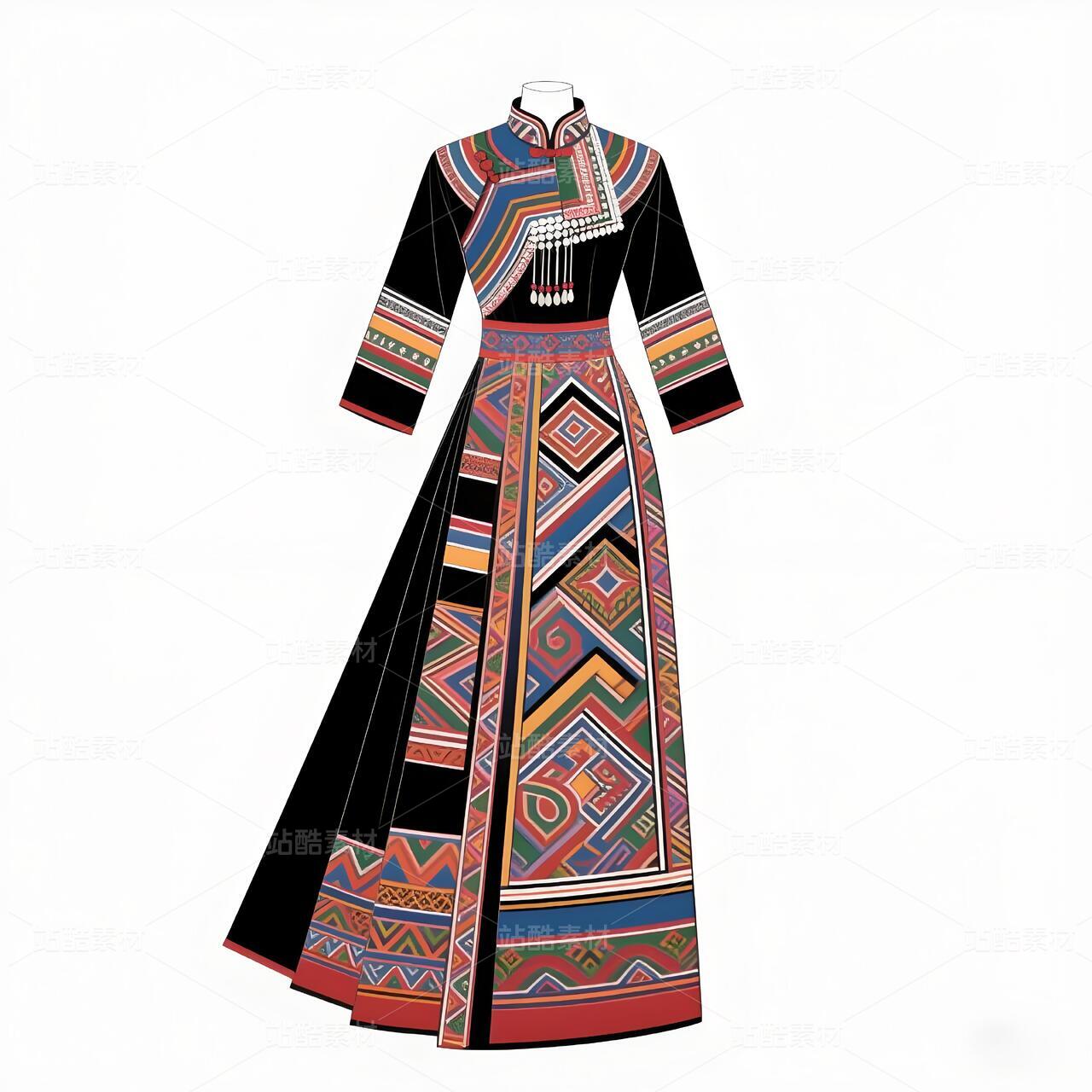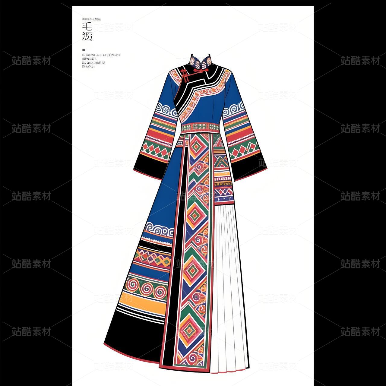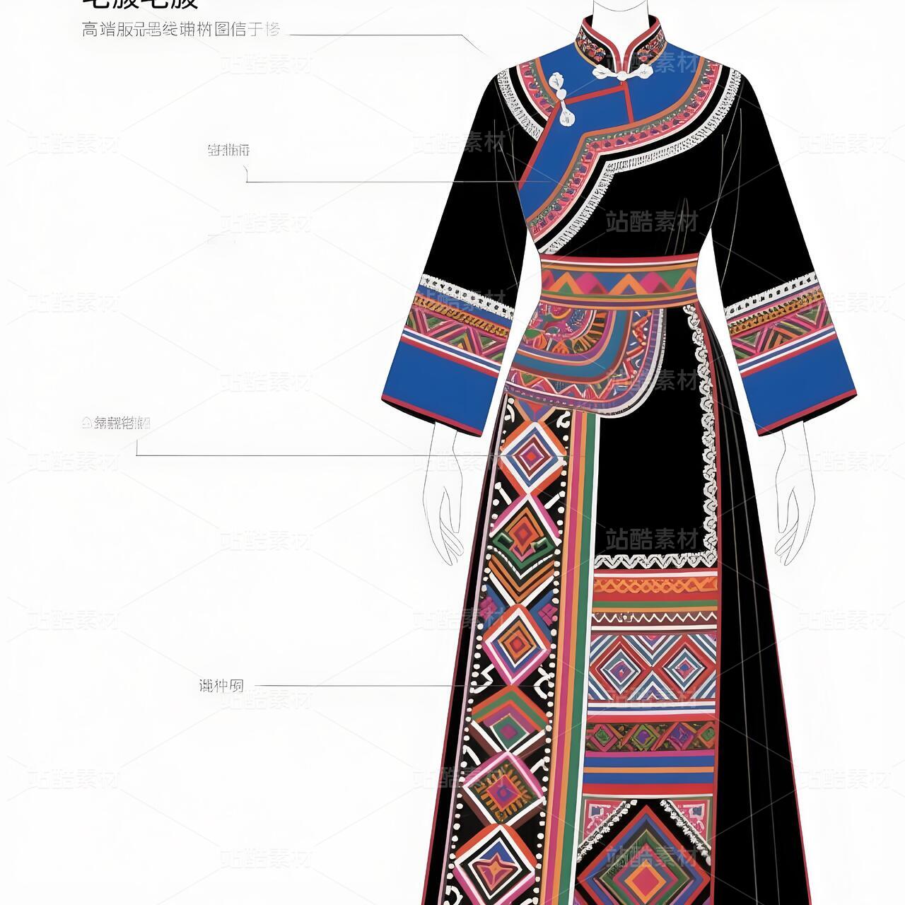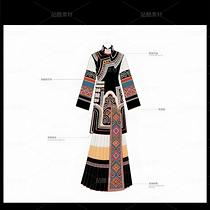 礼服以现代立体剪裁重构毛南族传统廓形,收腰长袍配不对称层叠下摆,象征喀斯特地貌的坚韧与灵动。主色调采用靛蓝绸缎与朱红织锦碰撞,衣襟镶金银丝绣制的"花竹帽"菱形纹样,肩部嵌凤凰图腾刺绣呼应"百鸟衣"传说。腰间垂挂925银锻造的"三界环"腰链,下摆褶皱如梯田波纹,袖口参数化设计的云雷纹暗藏古歌韵律。九道纯铜盘扣沿中轴线排列,复现分龙节祭祀仪轨。白色背景凸显图腾叙事,实现非遗技艺的当代转译。