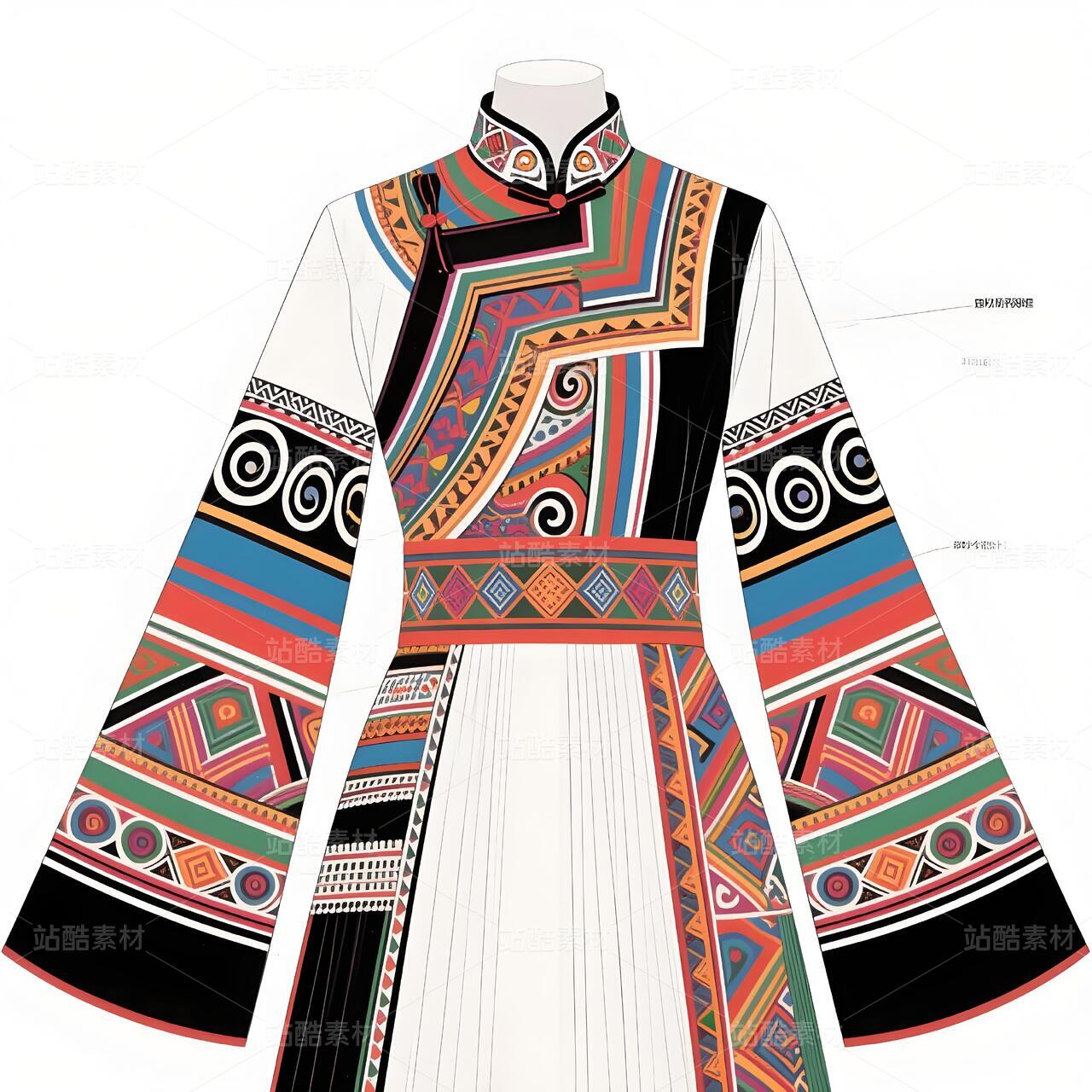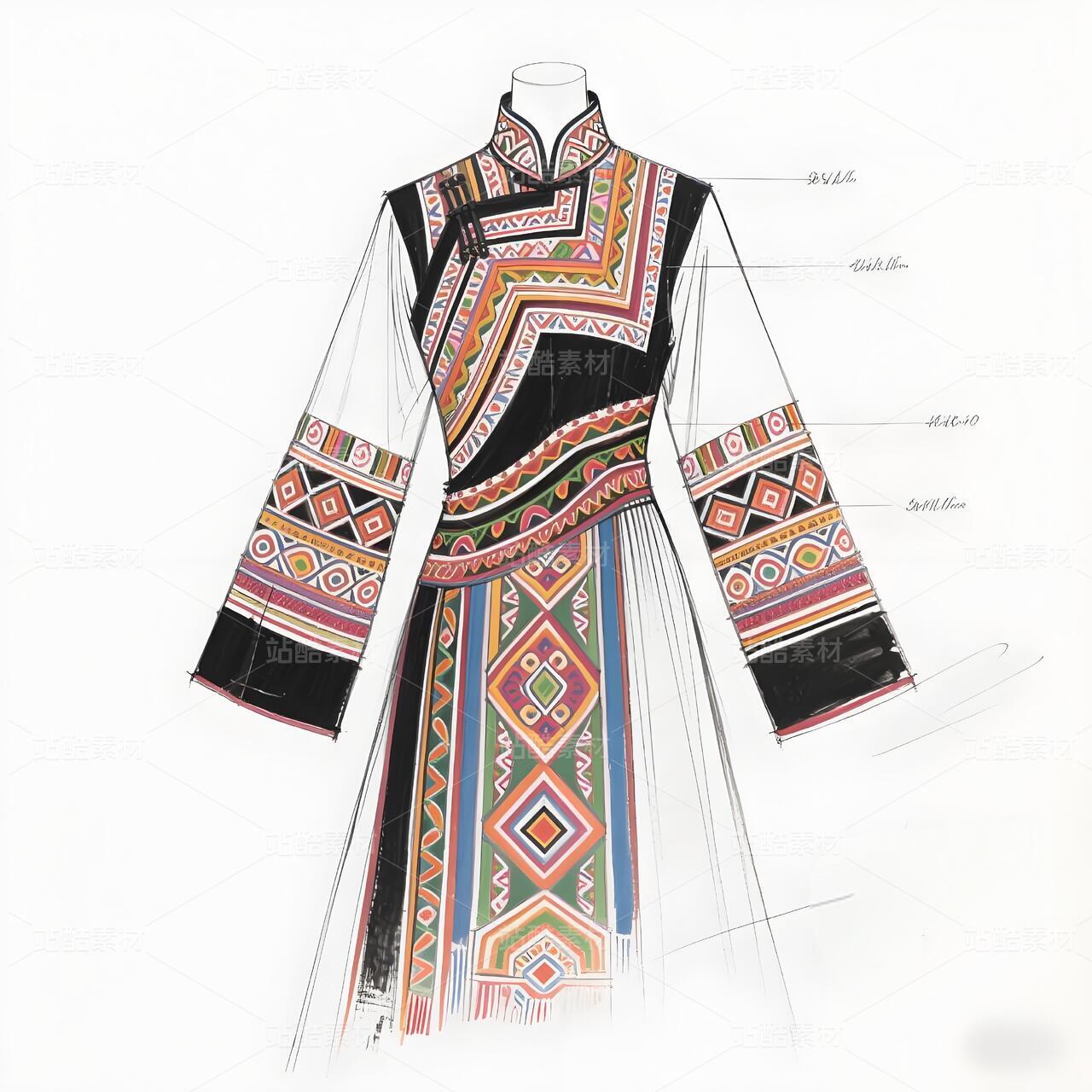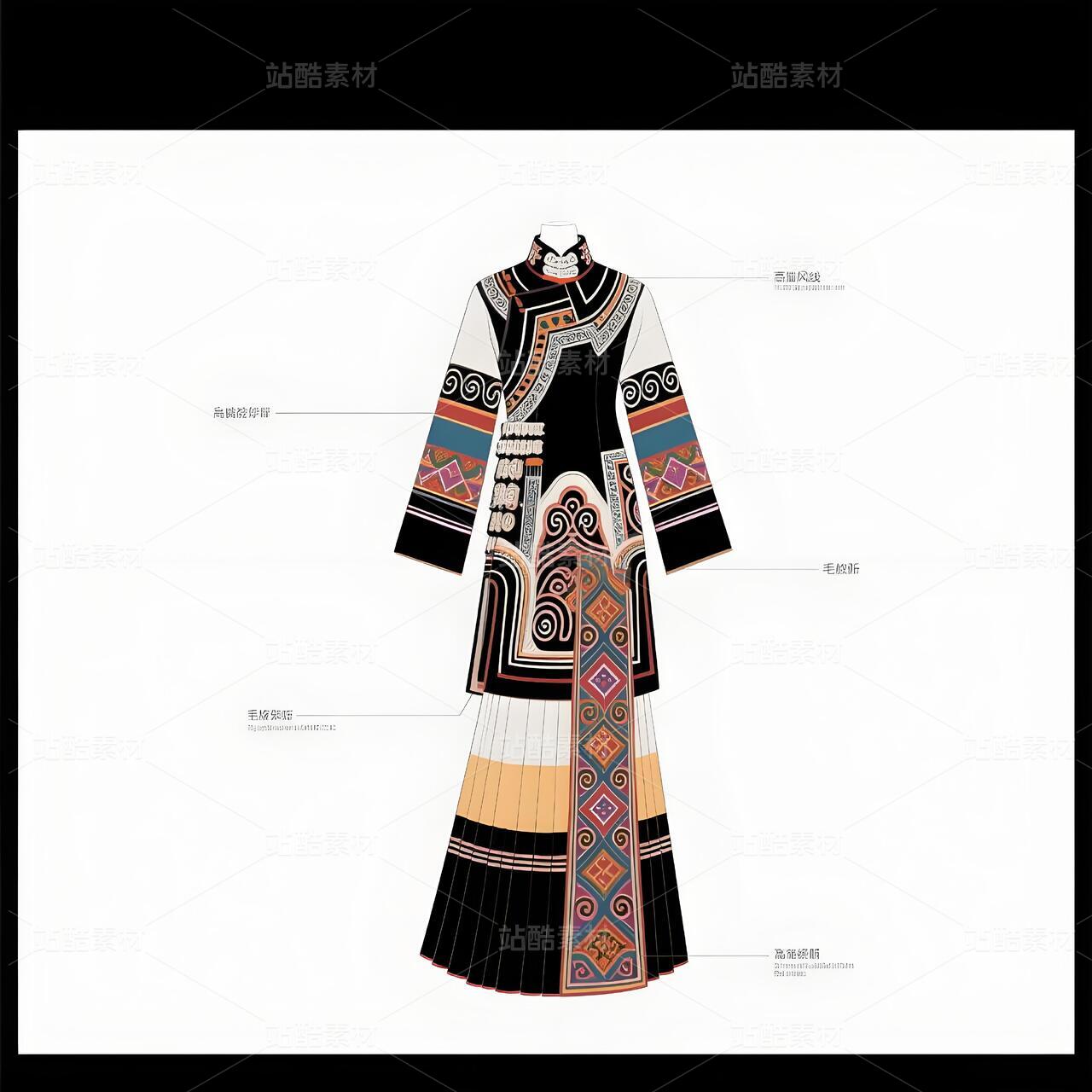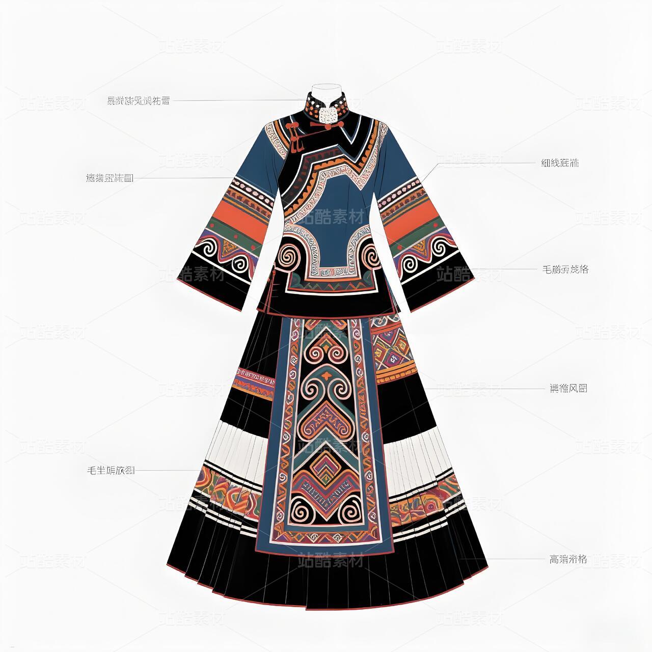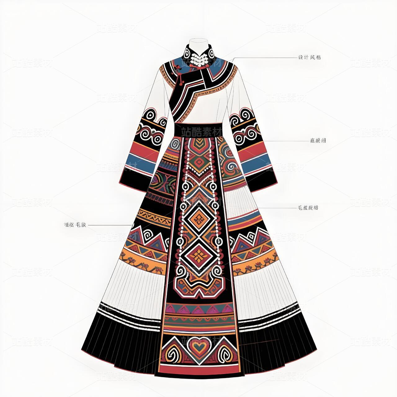 礼服以现代立体剪裁重构毛南族传统廓形,收腰长袍配不对称层叠下摆,象征喀斯特地貌的坚韧与灵动。主色调采用靛蓝绸缎与朱红织锦碰撞,衣襟镶金银丝绣制的"花竹帽"菱形纹样,肩部嵌凤凰图腾刺绣呼应"百鸟衣"传说。腰间垂挂925银锻造的"三界环"腰链,下摆褶皱如梯田波纹,袖口参数化设计的云雷纹暗藏古歌韵律。九道纯铜盘扣沿中轴线排列,复现分龙节祭祀仪轨。白色背景凸显图腾叙事,实现非遗技艺的当代转译。