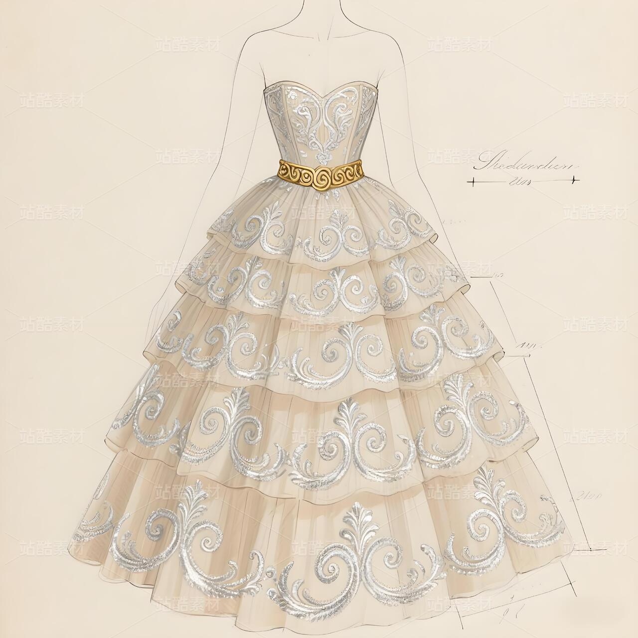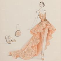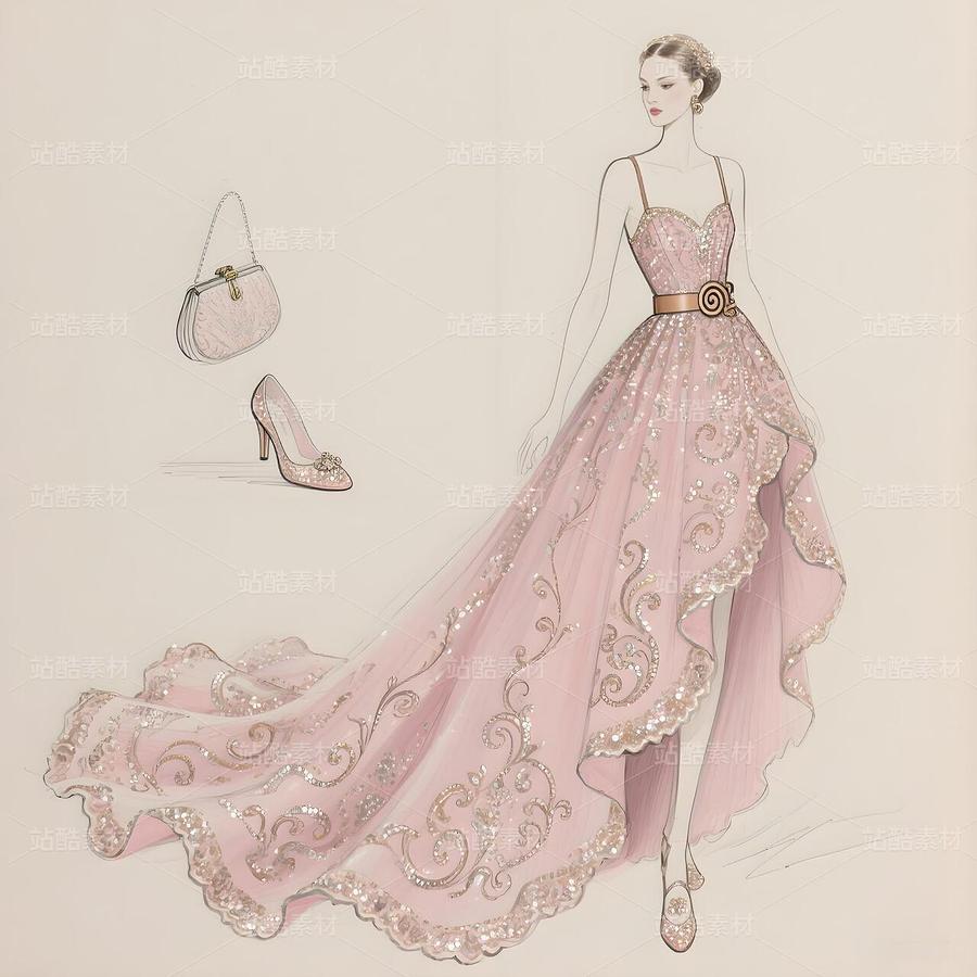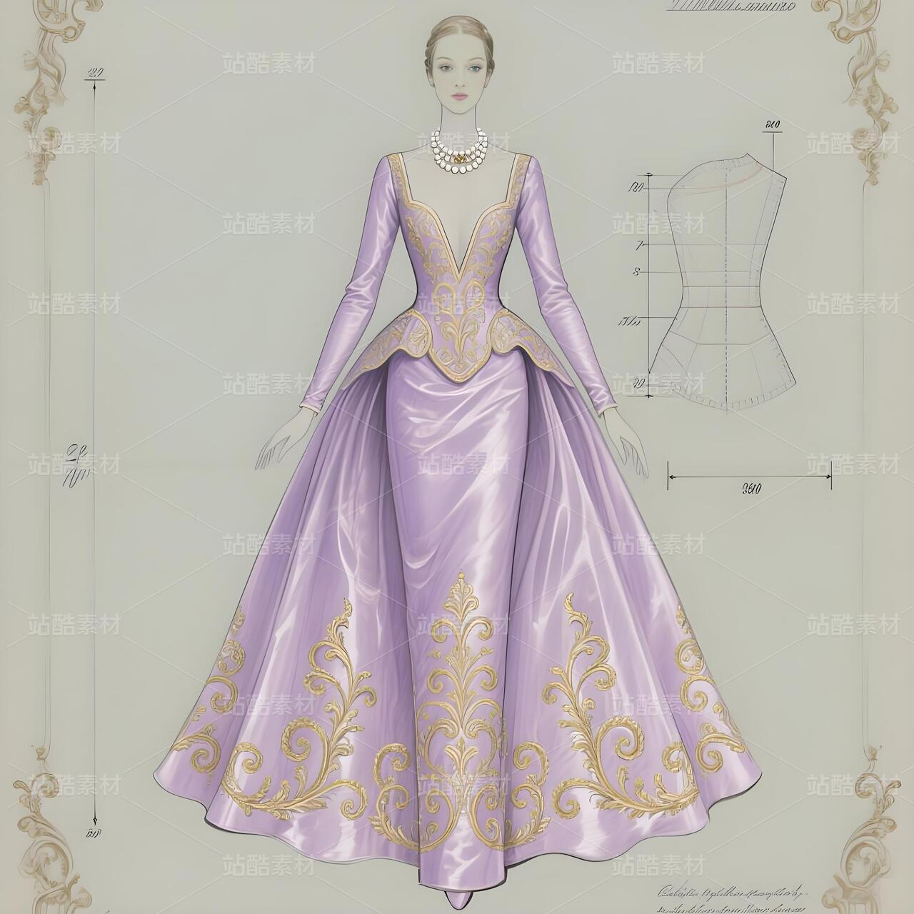 这幅设计手稿,是十八世纪法兰西优雅灵魂在当代高定画布上的惊艳复苏。它以纸为舞台,用线条与想象,复现了洛可可艺术最核心的视觉密码——卷草纹样(Rocaille),并将其编织进一件如梦似幻的高级定制礼服的基因之中。