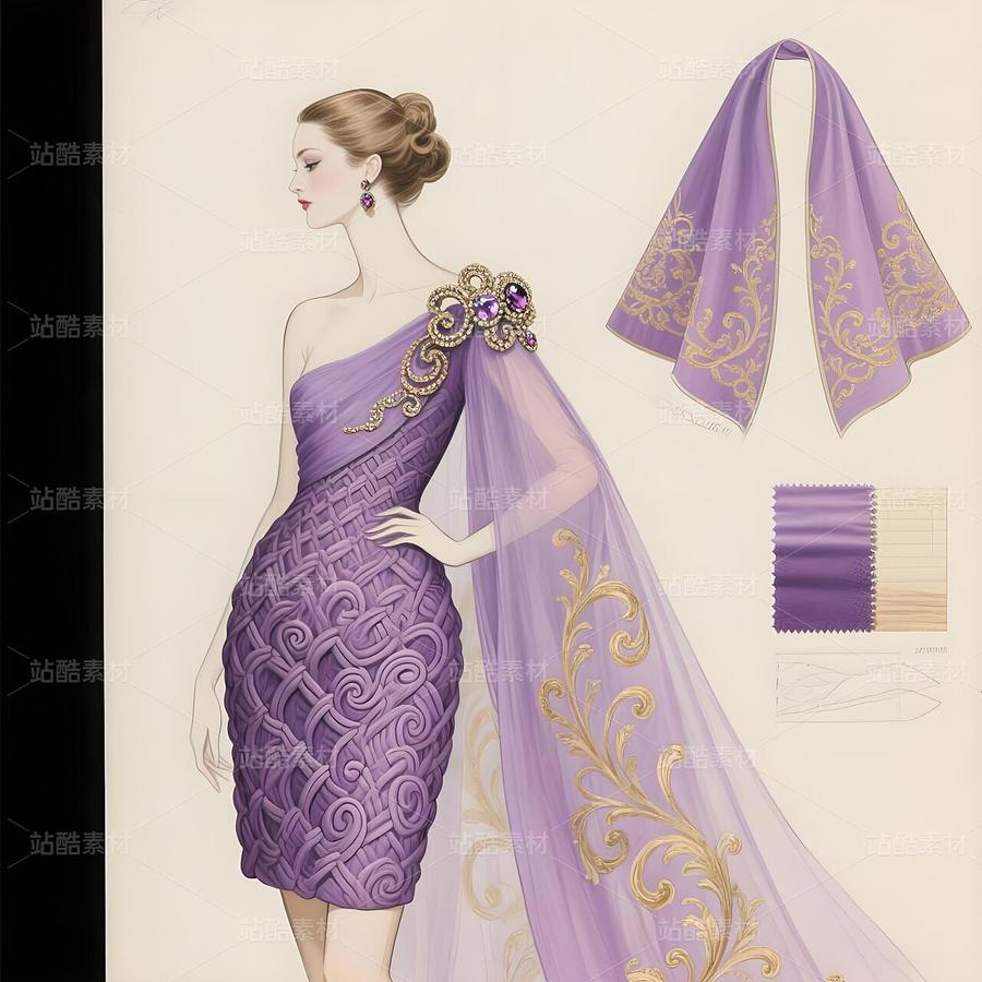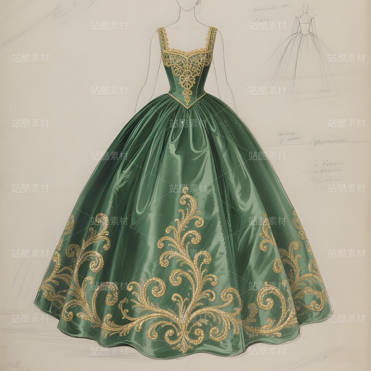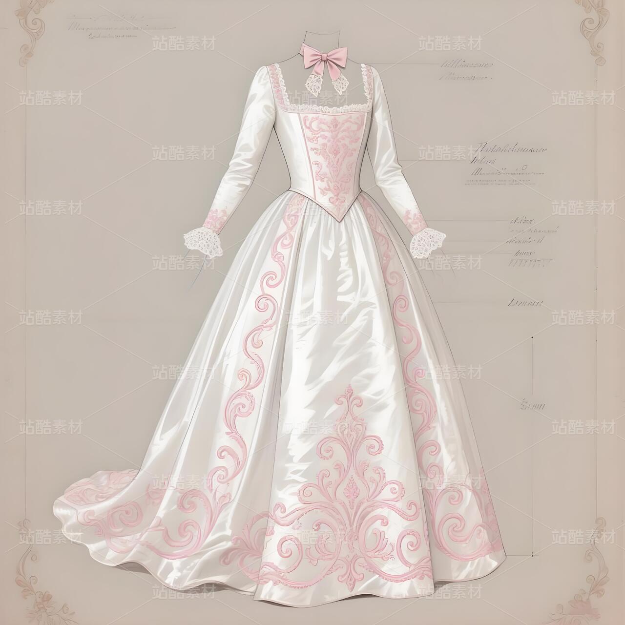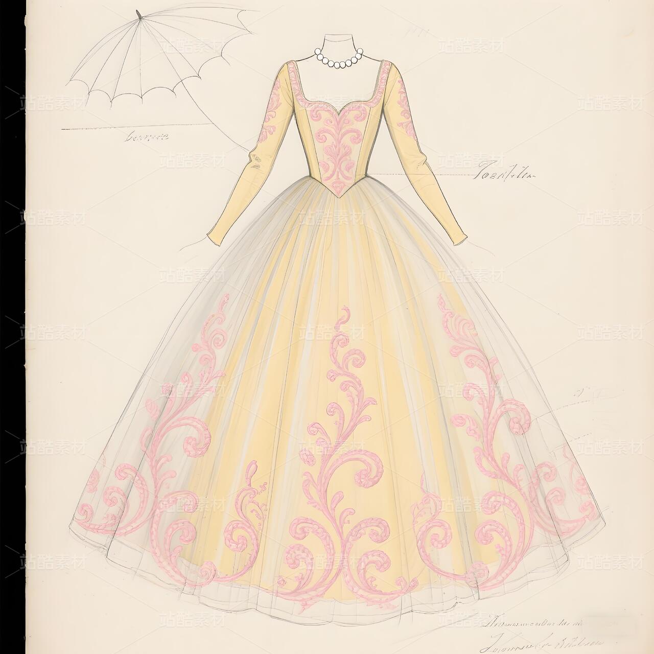 这幅设计手稿,是十八世纪法兰西优雅灵魂在当代高定画布上的惊艳复苏。它以纸为舞台,用线条与想象,复现了洛可可艺术最核心的视觉密码——卷草纹样(Rocaille),并将其编织进一件如梦似幻的高级定制礼服的基因之中。
