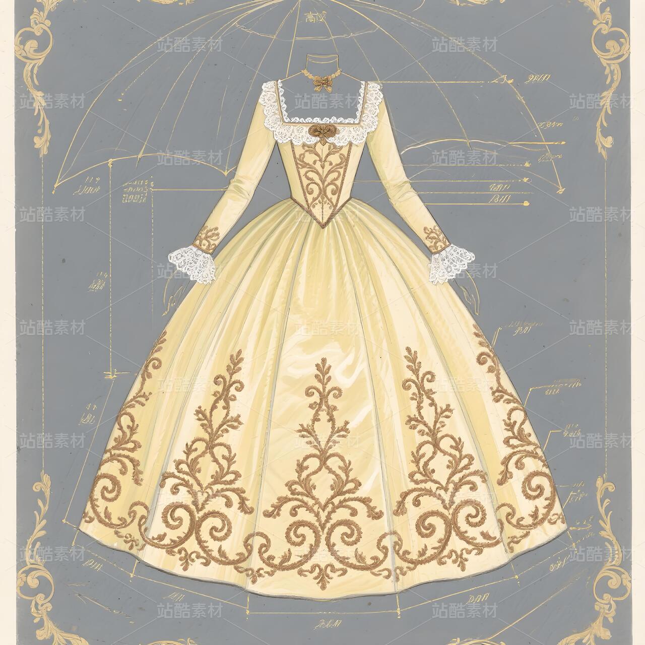 手稿的灵魂,在于将洛可可最具标志性的装饰语言——卷草纹样(Rocaille),演绎得淋漓尽致,使其成为礼服跳动的脉搏: