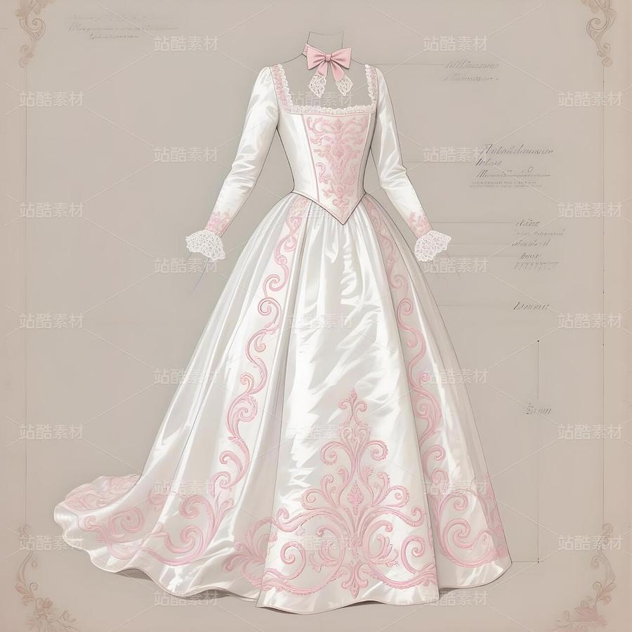 匠心的璀璨光芒: 纹样的呈现方式,是对极致奢华与精湛工艺的想象。设想以最顶级的金银丝线进行繁复无比的手工刺绣,在象牙白或香槟粉真丝缎的底料上,勾勒出纹样精致的骨架与神韵。珍珠母贝(Mother of Pearl) 被精密切割、雕琢成微型的贝壳或花瓣形状,恰到好处地点缀于藤蔓的节点或花朵中心,捕捉并折射每一缕光线,流淌出温润的虹彩。剔透的水晶或莱茵石则如同凝结的朝露,星星点点地洒落在叶片与花瓣之间,赋予整件礼服梦幻般的立体感与闪烁光芒。纹样的疏密布局经过精心设计,在视觉焦点(如前胸、臀部膨起处)可能较为繁复华丽,向下则渐趋疏朗通透,形成富有韵律的视觉节奏与呼吸感。
