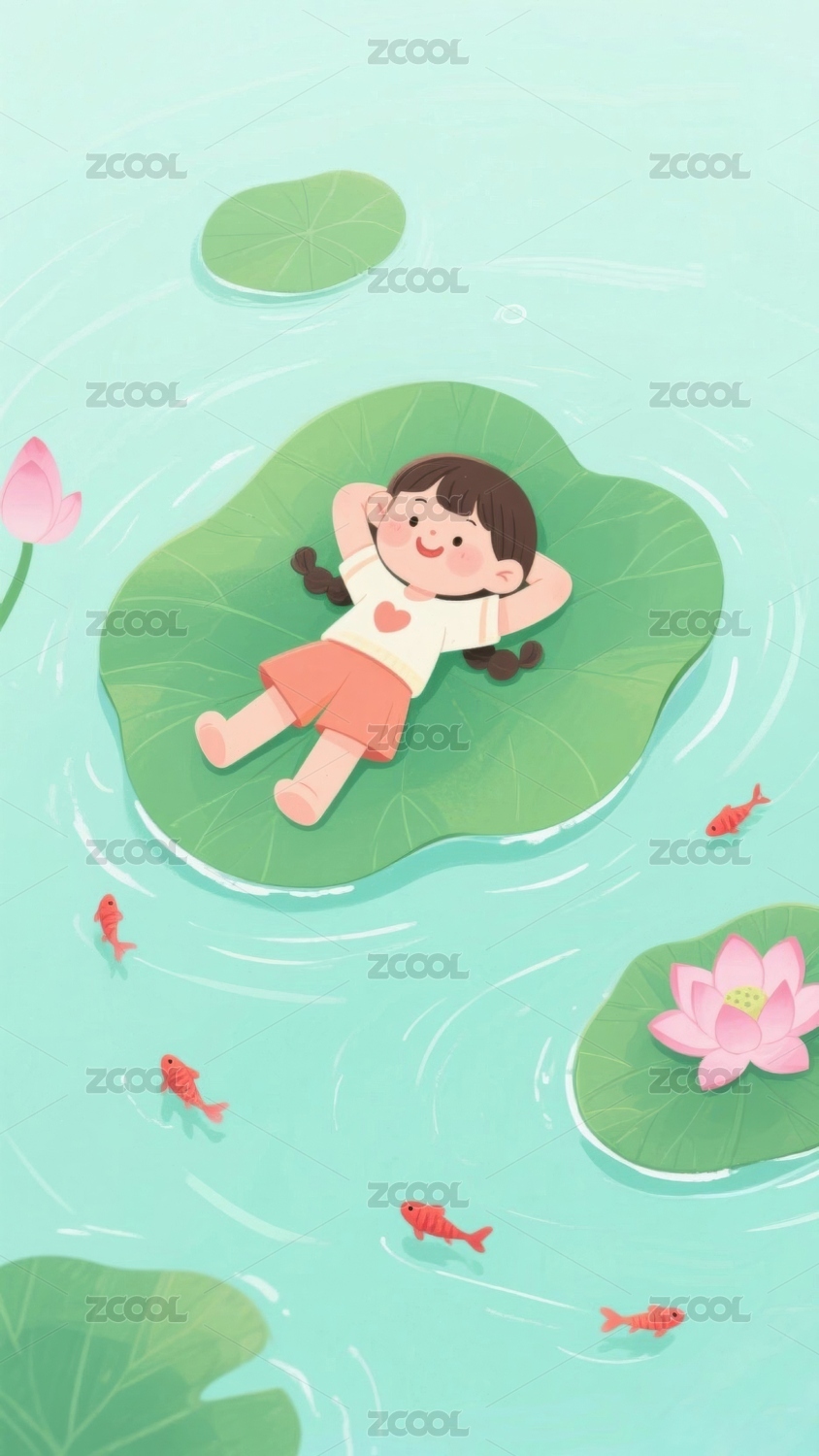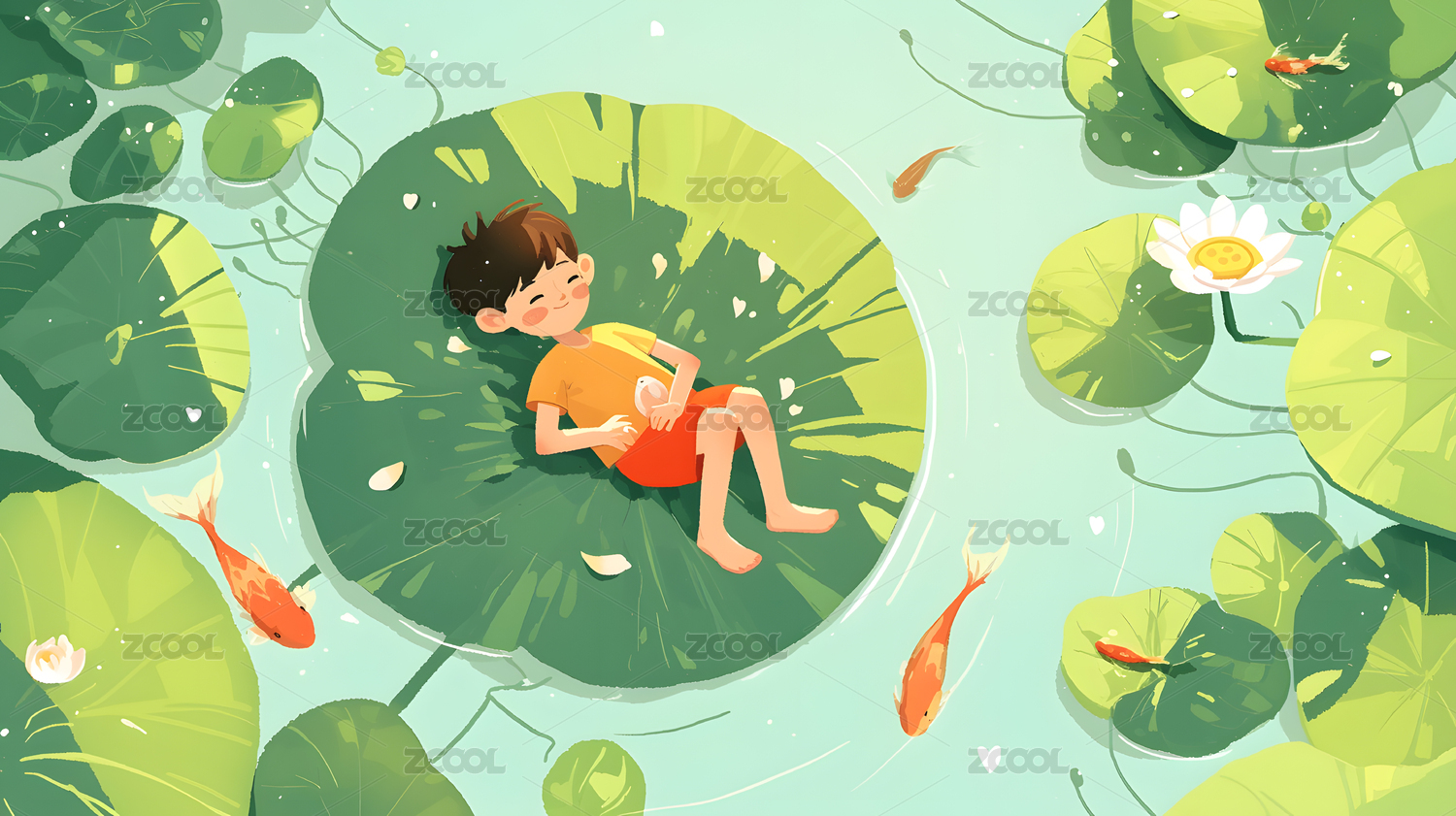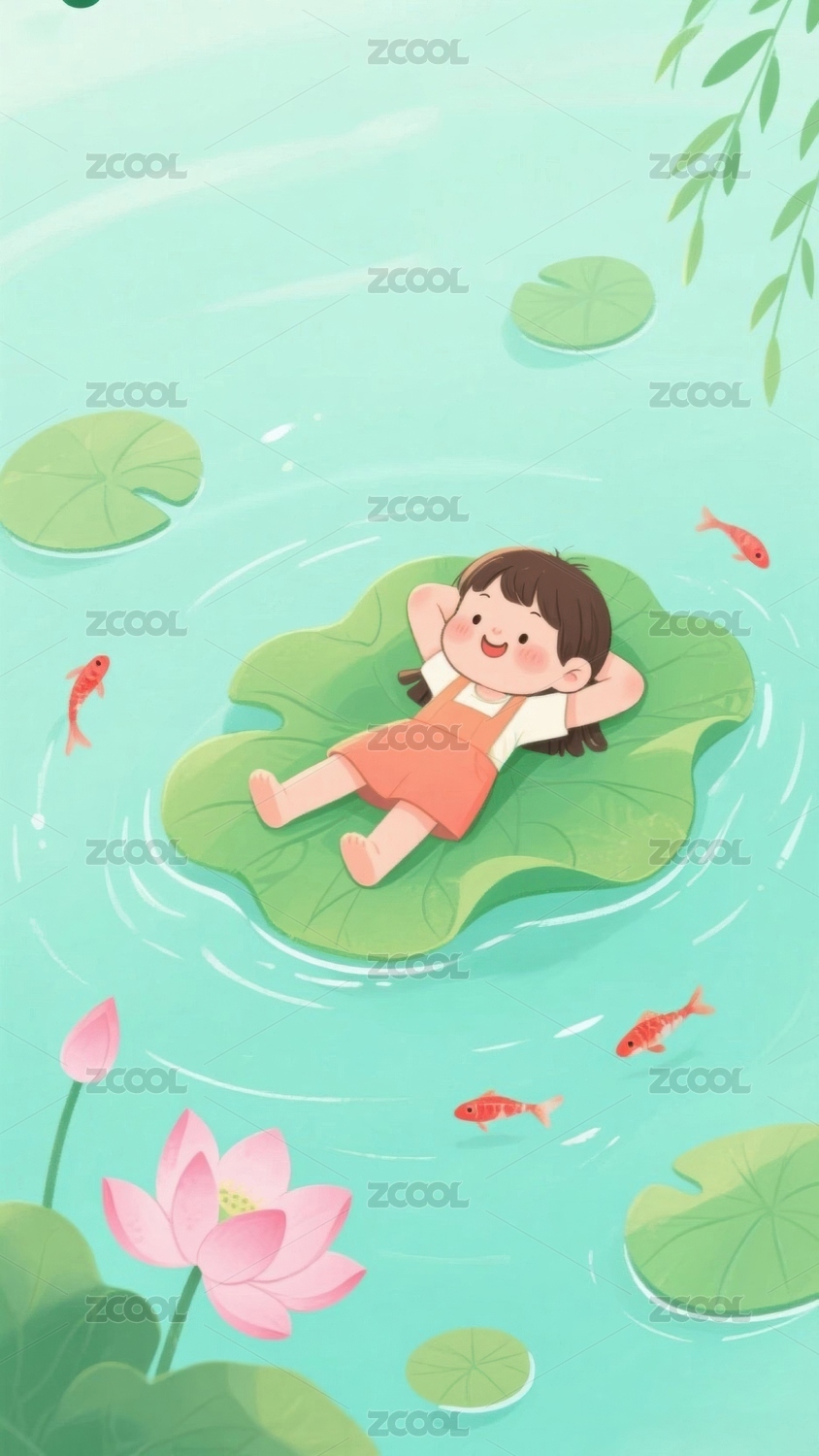 荷塘带虎头帽小男孩木盆采莲蓬鸭子草丛纹理绘本插画