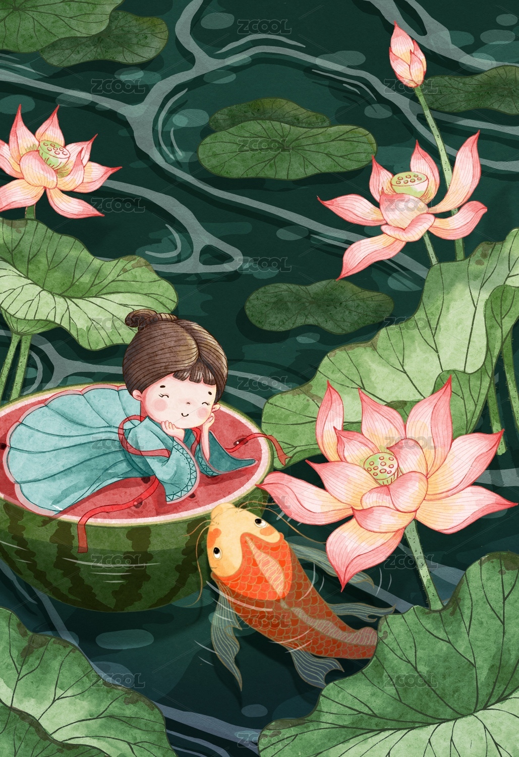 女孩和荷花锦鲤