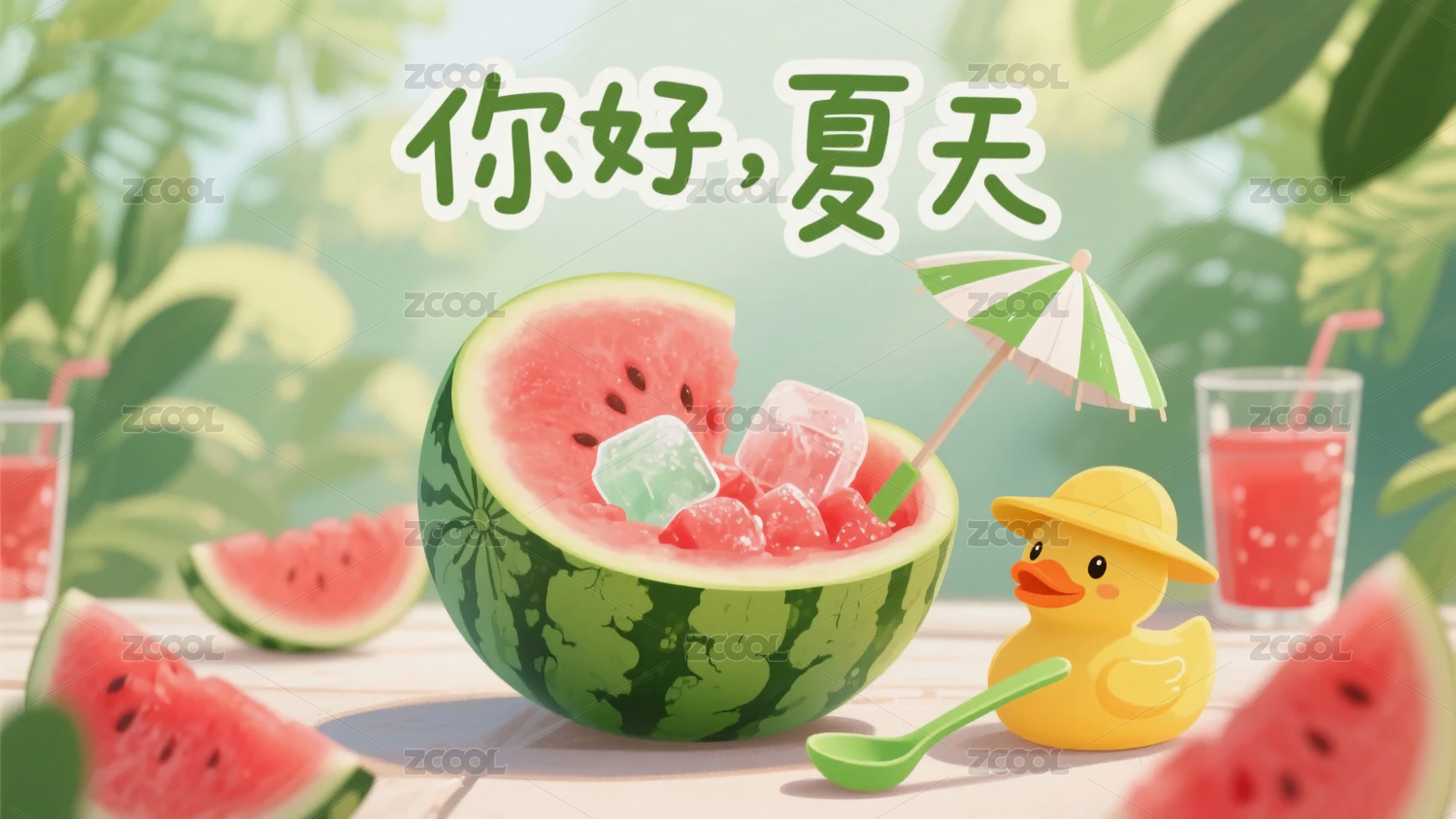 你好夏天清新荷叶西瓜锦鲤矢量插画