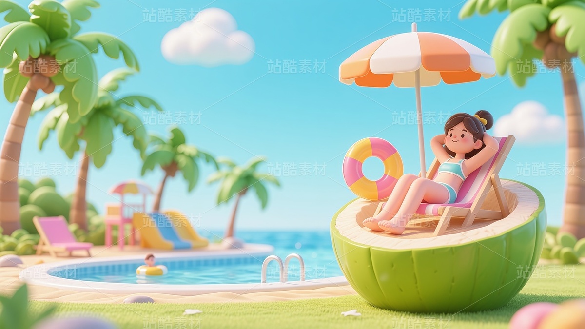 夏日海边沙滩度假出游夏季海滩3D清新插画