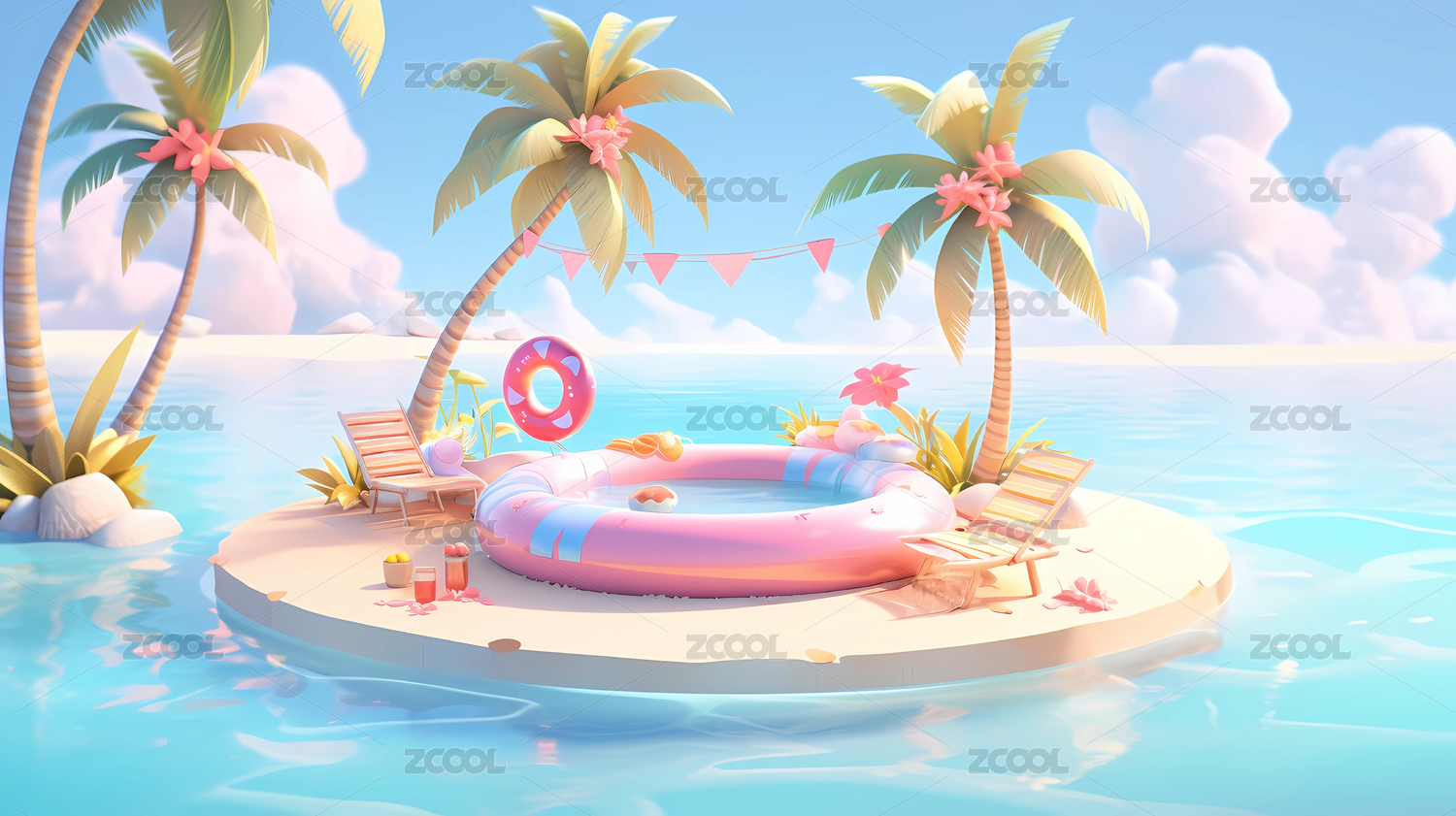 夏日度假概念沙滩上的游泳圈遮阳伞3D背景