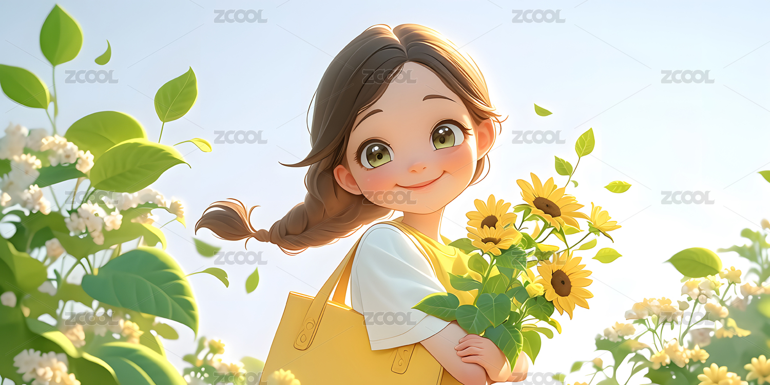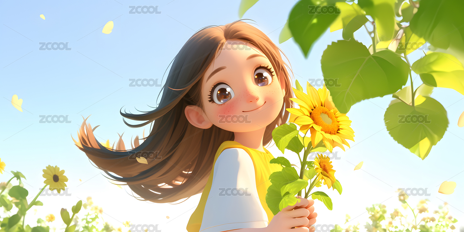 3D卡通女孩手捧向日葵