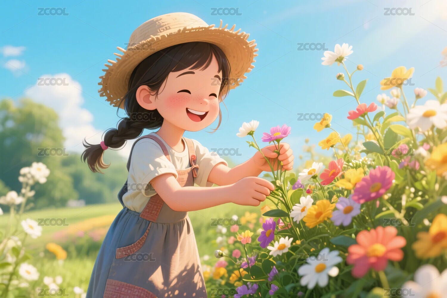 田园中采花的女孩