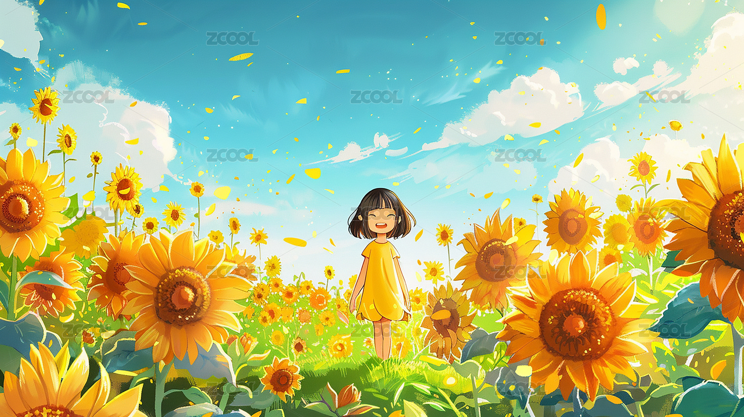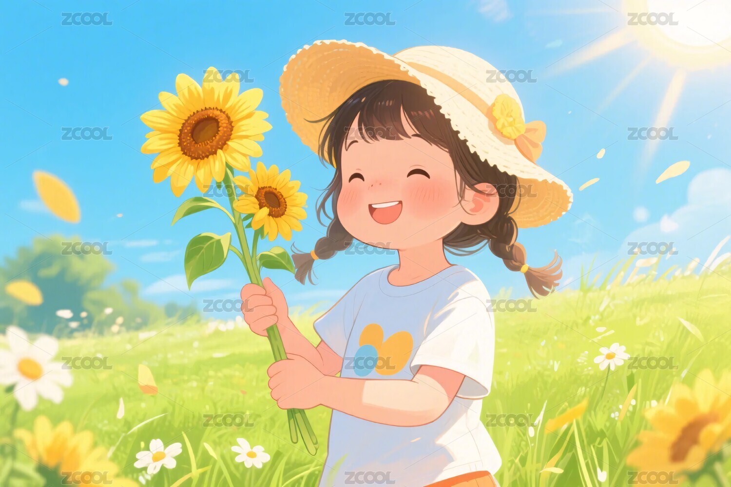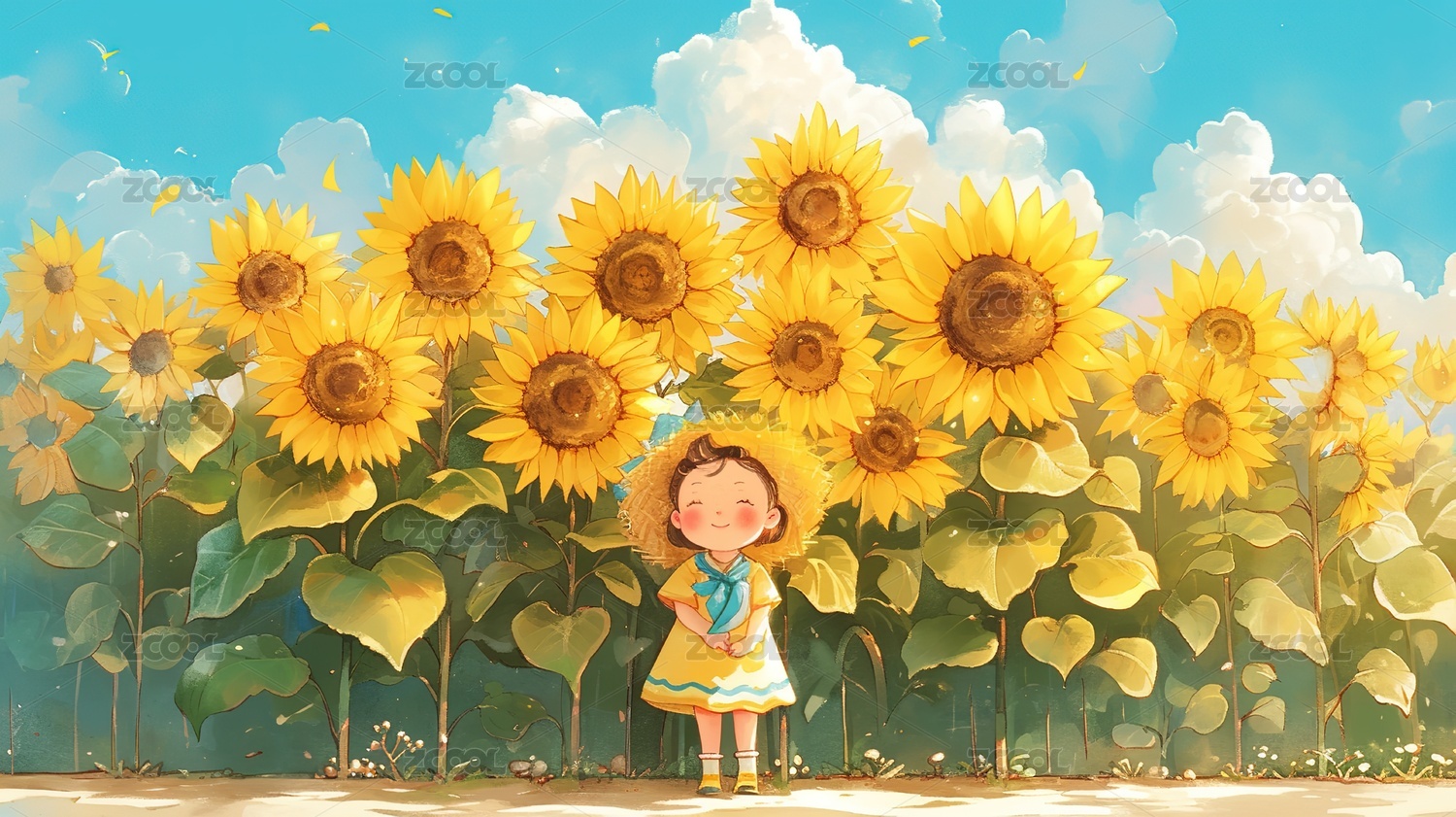 小女孩捧向日葵插画