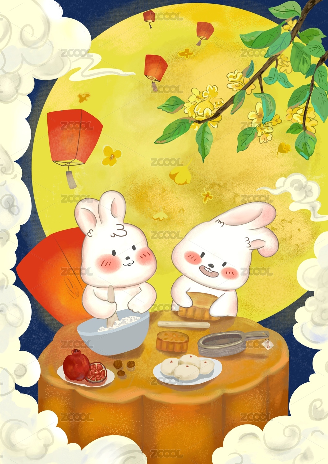 中秋节兔子在桂花树下做月饼