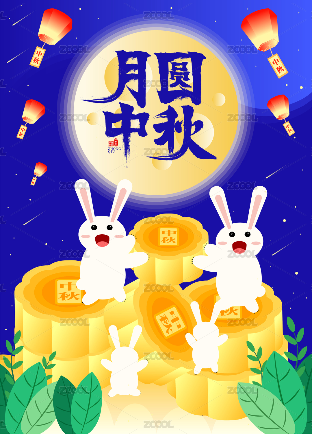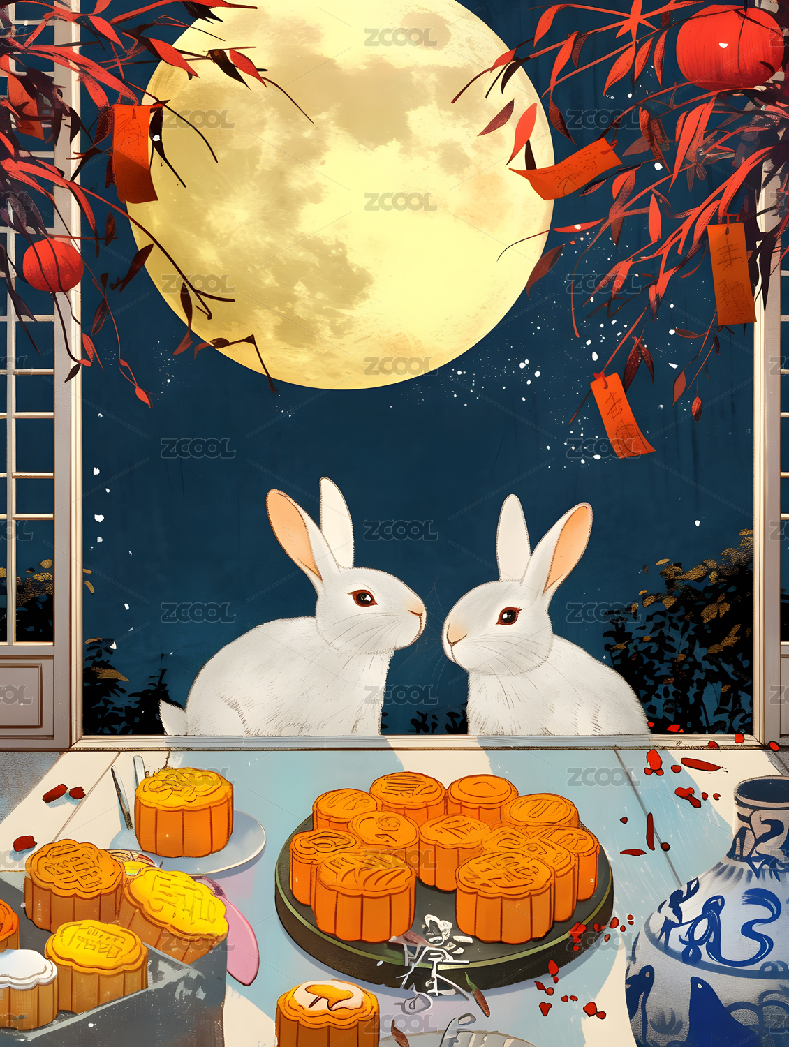 中秋节月亮下的月饼和玉兔插画背景壁纸