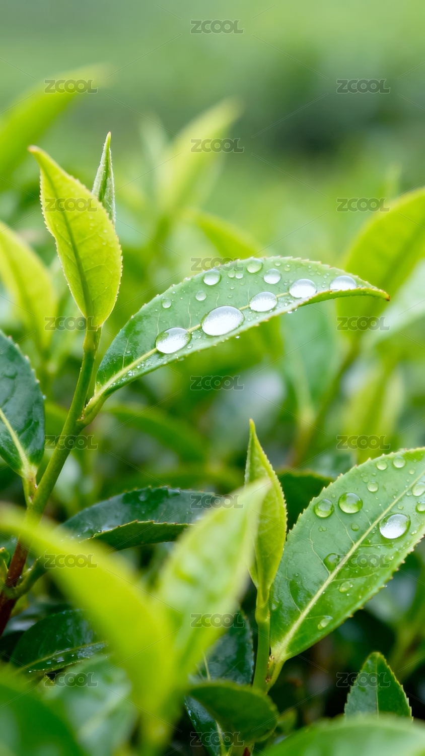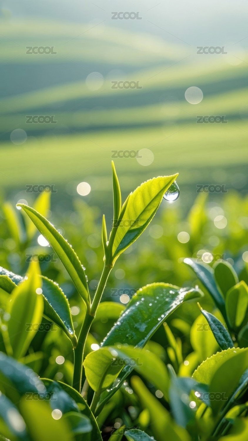 清晨露珠点缀的嫩绿茶叶