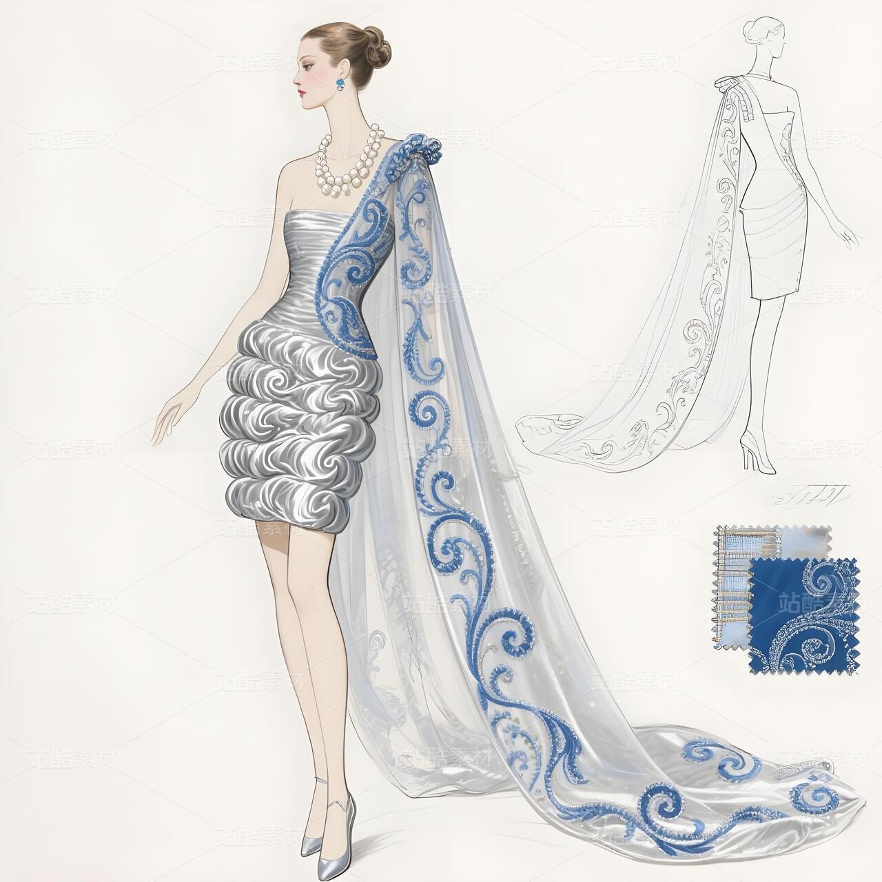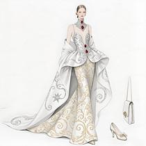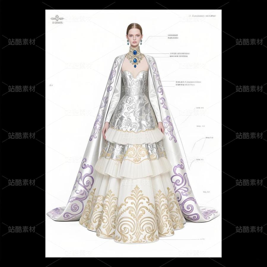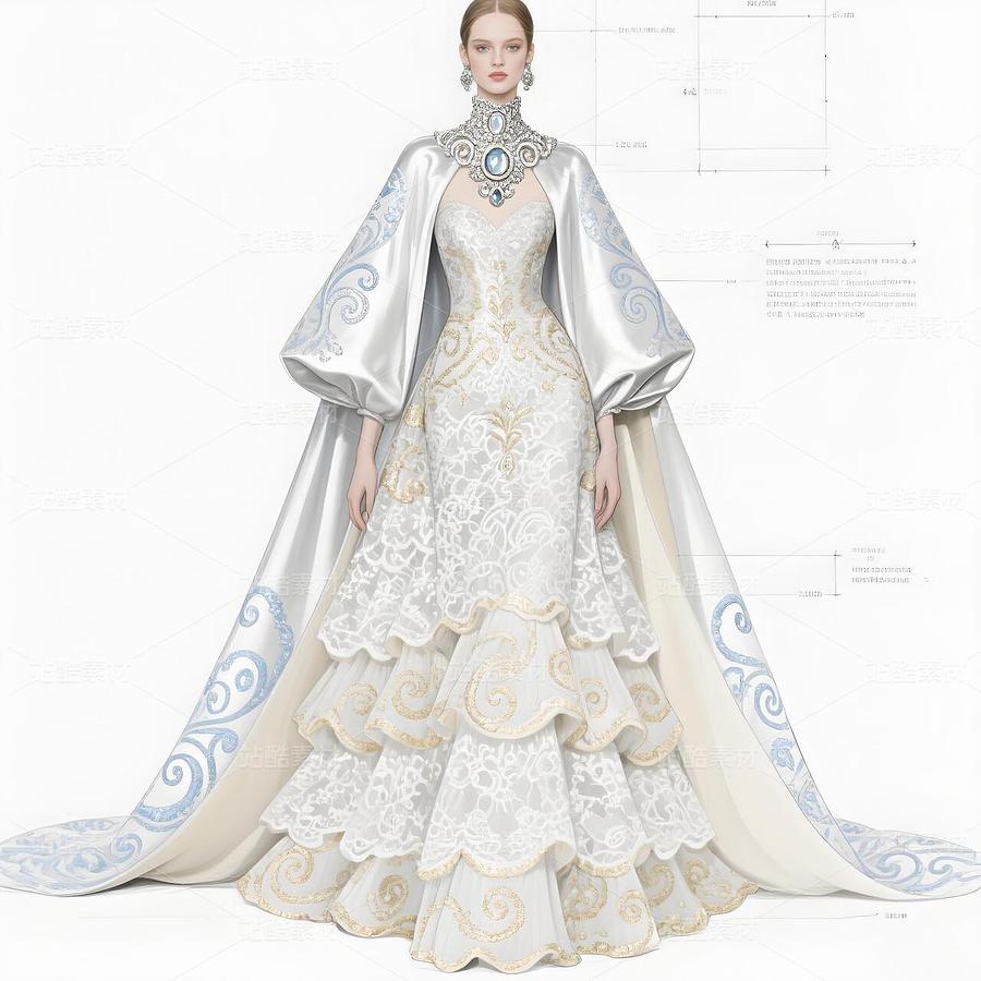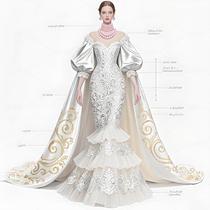银白绉缎如坍缩的星云垂落,米白蓬蓬裙撑以碳纳米管编织出凡尔赛宫镜厅的十一维弦论模型。高耸拉夫领蚀刻着哈勃深场星图裂纹,冰晶披风内嵌石墨烯温感电路——遇体温即显影蓬帕杜夫人失传的「月光冶金术」。裙摆涡卷纹实为路易十五情书经傅里叶变换后的概率云,0.08毫米微型棱镜勾边,在红毯镁光灯下折射出量子纠缠的虹彩混沌。