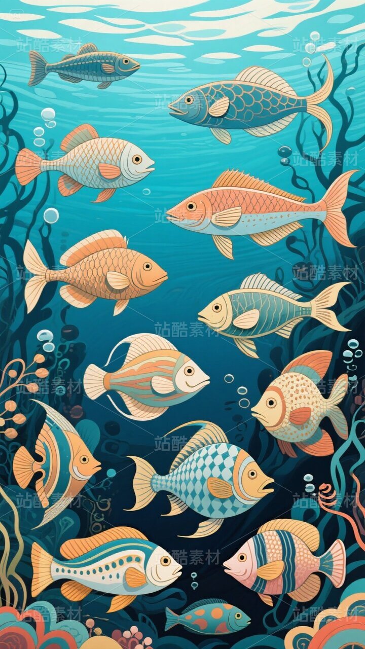 jimeng-2025-06-24-4695-矢量插画,形态各异的鱼,背景是海洋深处,细节刻画,高端细腻,高饱和度高明度,古怪....jpeg