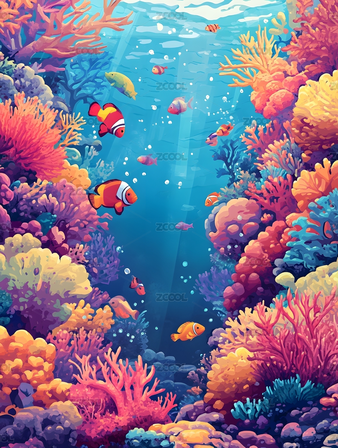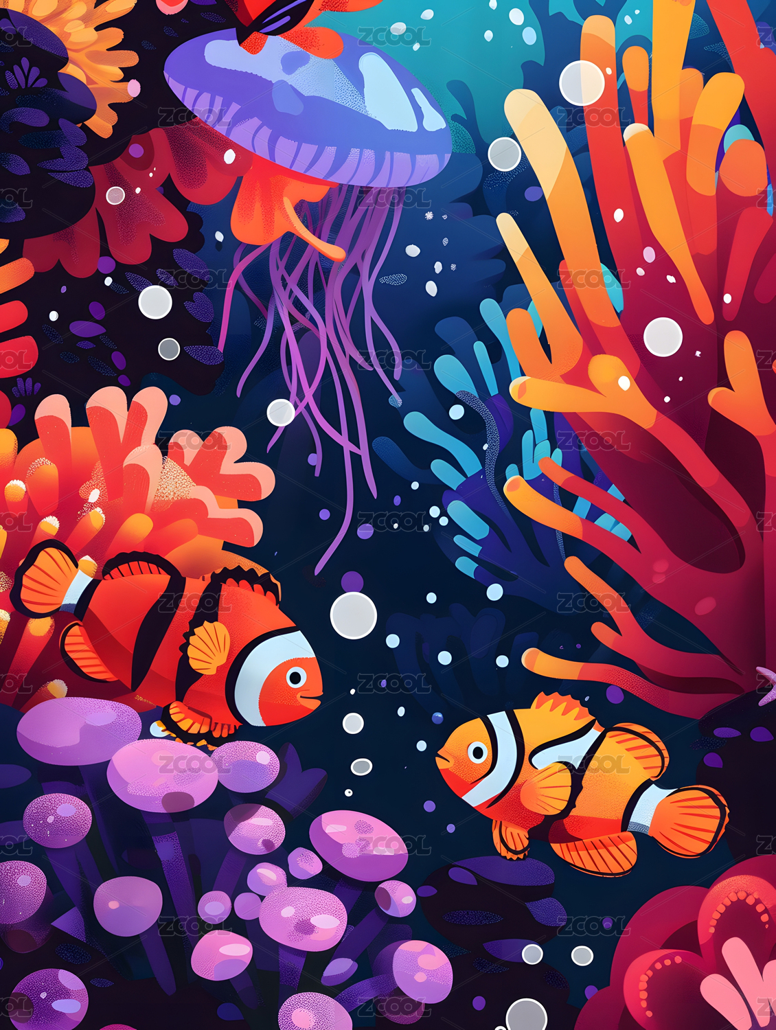 jimeng-2025-06-24-5252-矢量插画,形态各异的水生物,背景是海底,细节刻画,高端细腻,高饱和度高明度,古怪....jpeg