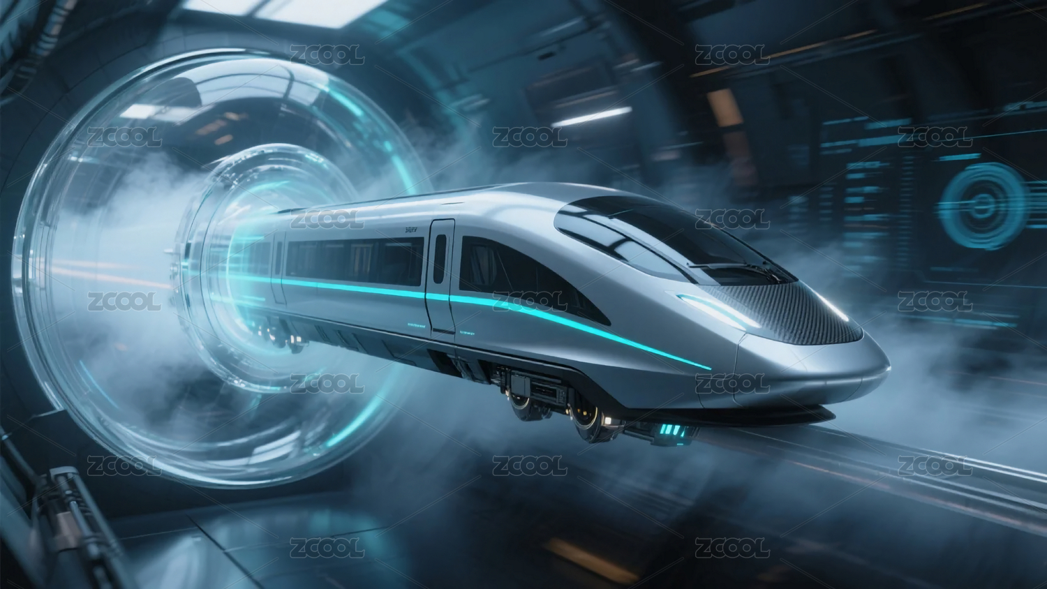 科幻磁悬浮火车高速通过磁力环赛博3D插画