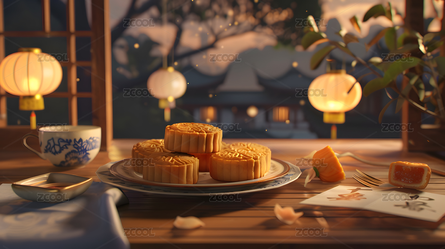 金黄月饼红灯笼节日氛围