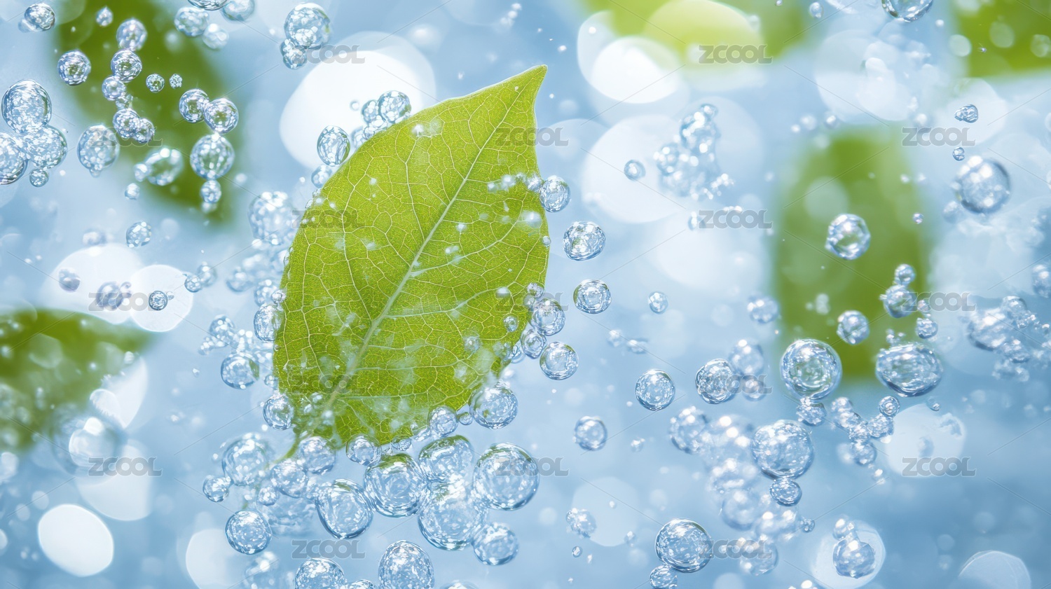 绿叶与气泡交织的清新景象