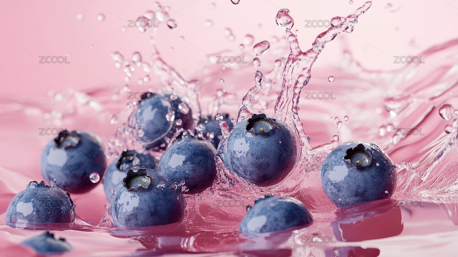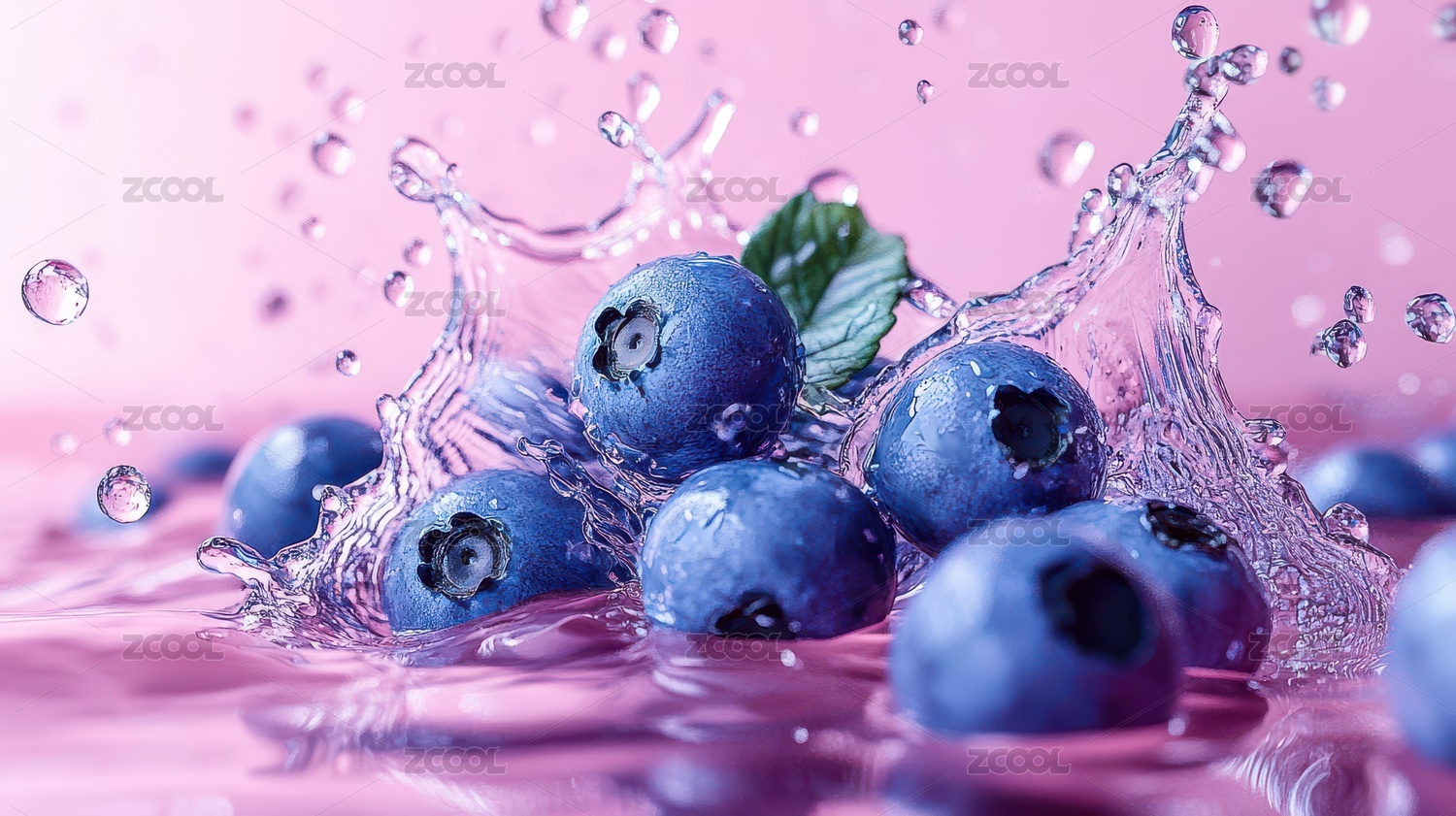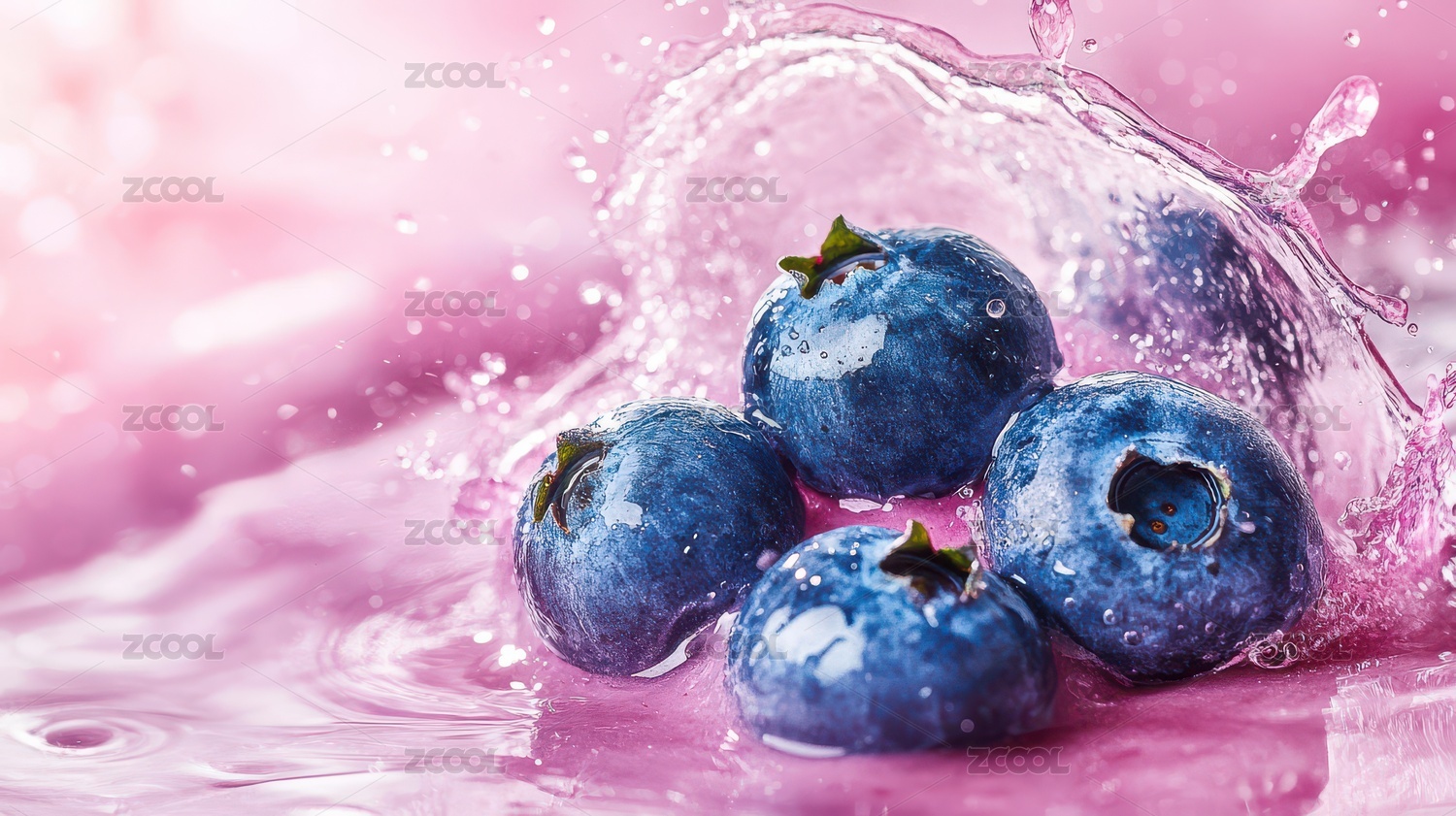 新鲜蓝莓在粉色水中飞溅的瞬间