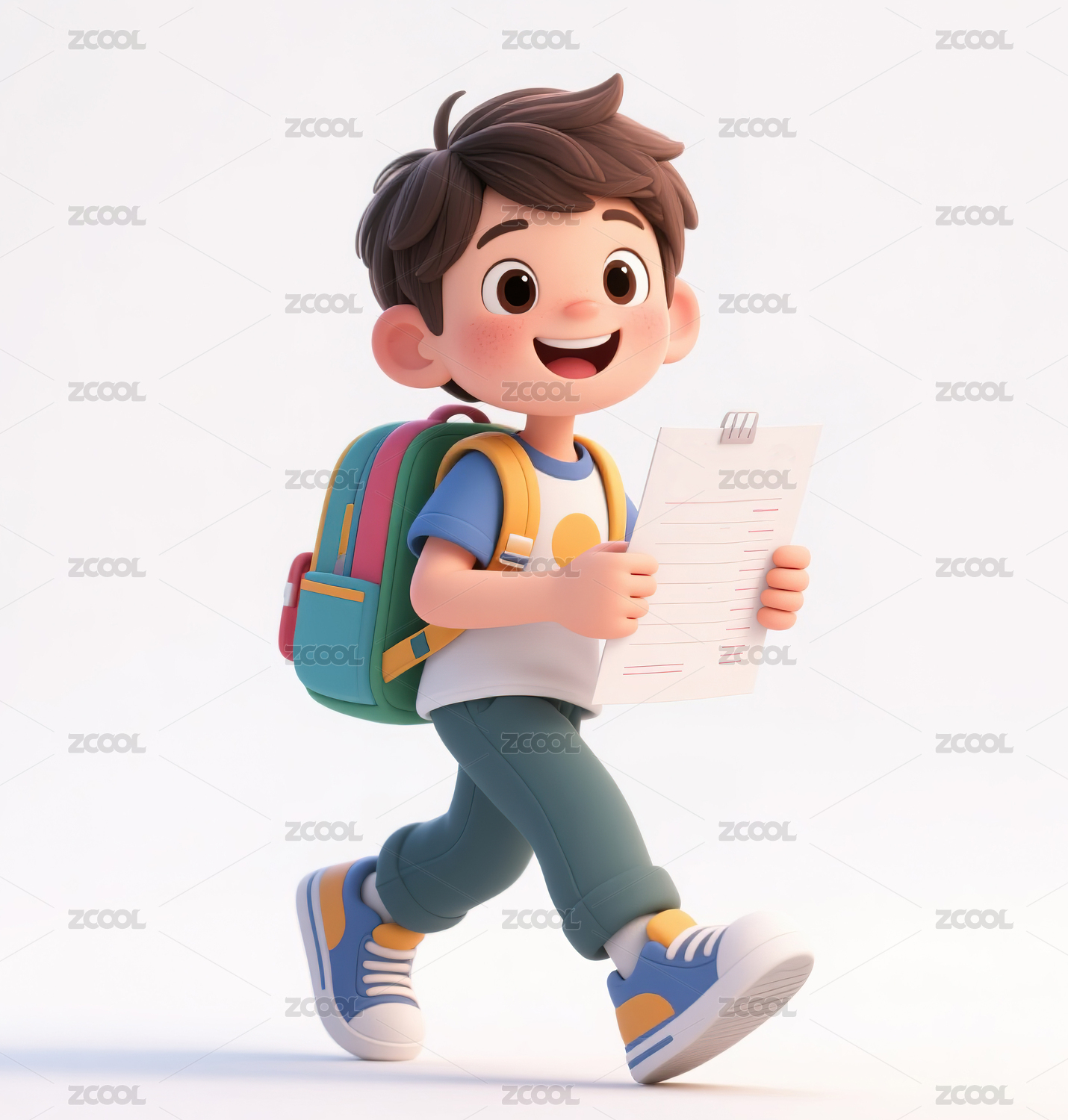 3D卡通可爱开心兴奋背着书包的男孩