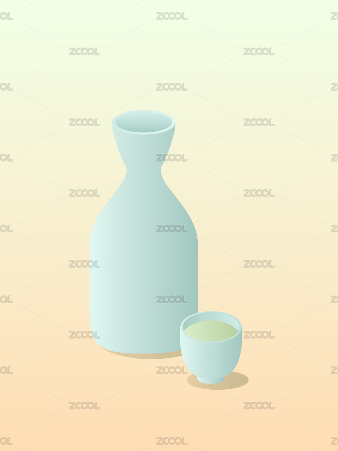 青绿色陶瓷烧酒瓶和酒杯食物矢量插画元素
