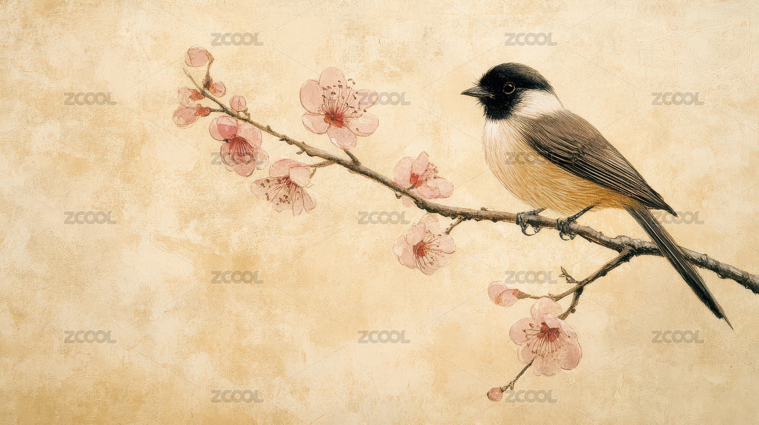 春枝栖鸟静谧诗意画卷