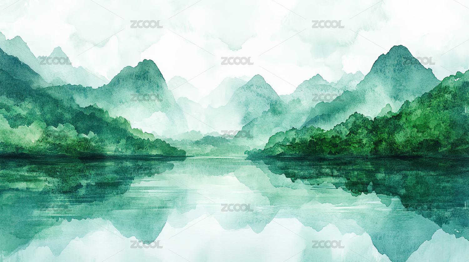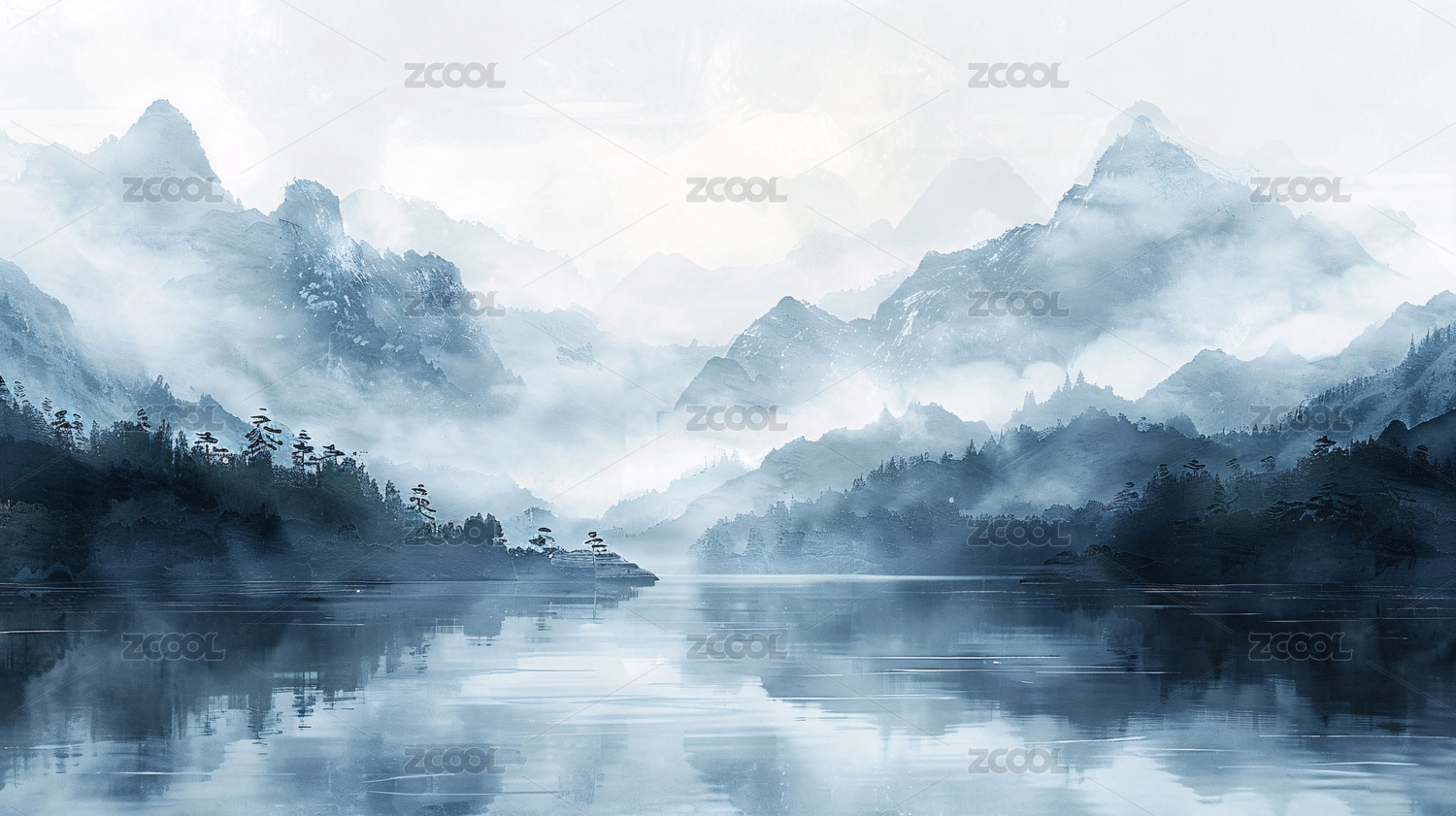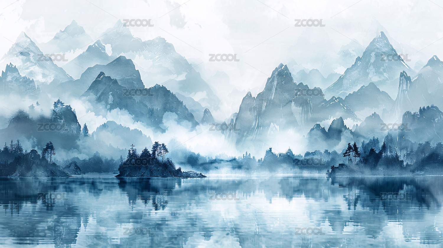 蓝色调的水墨风山水画,水墨风意境山水画概