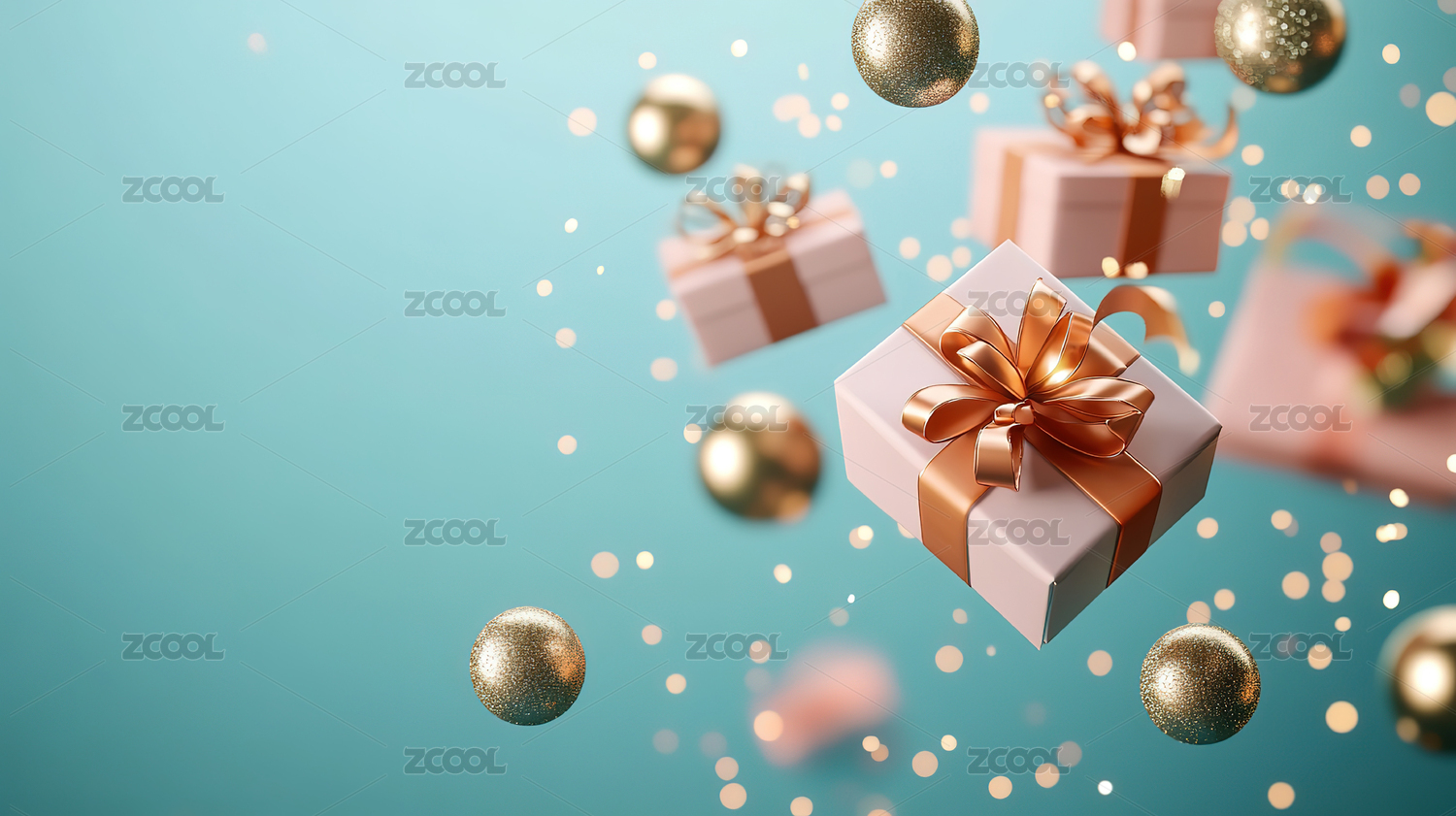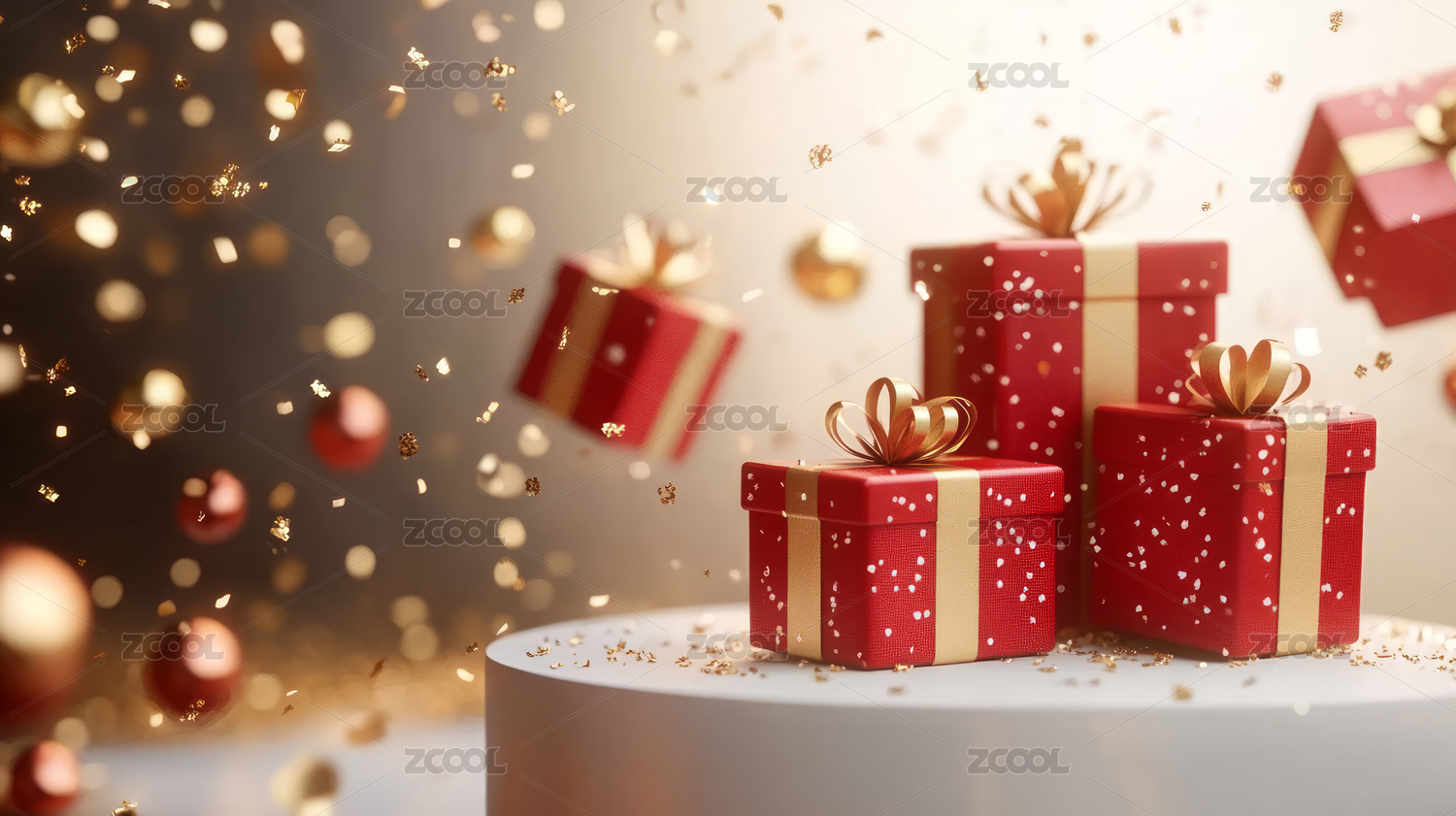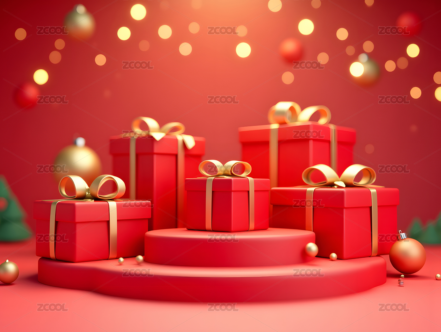 3D渲染红色圣诞装饰礼盒丝带闪耀背景