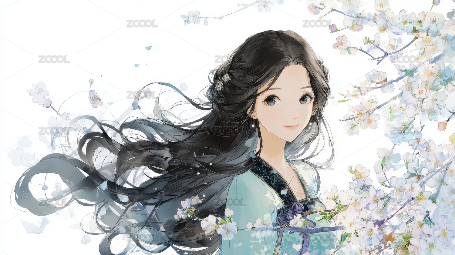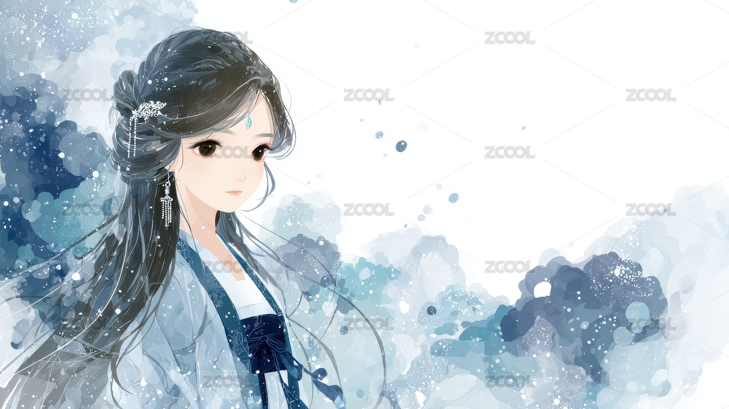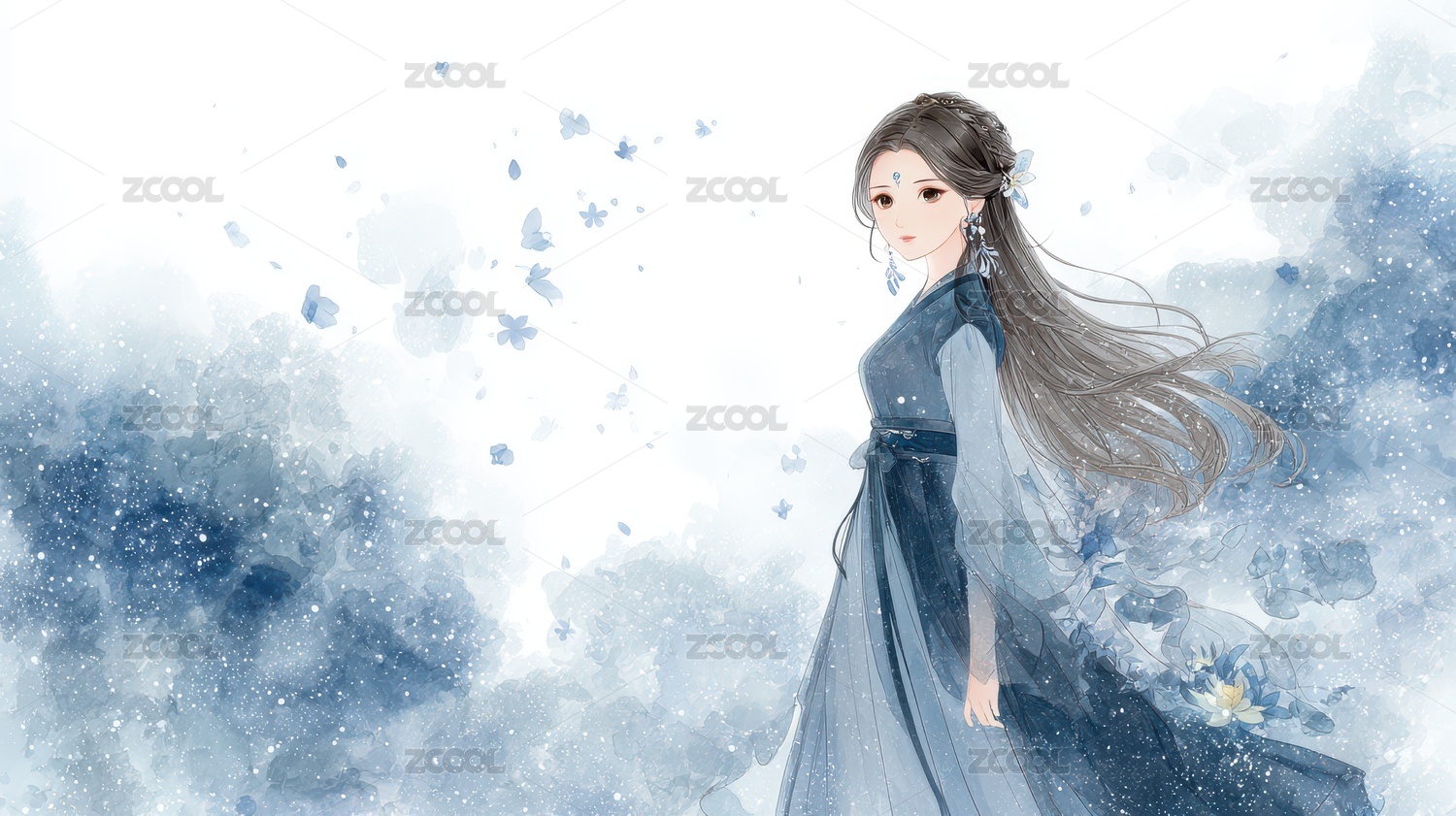 唯美,淡雅色彩,古典美人,水墨画,长发,传统服饰,飘逸服饰,虚幻背景