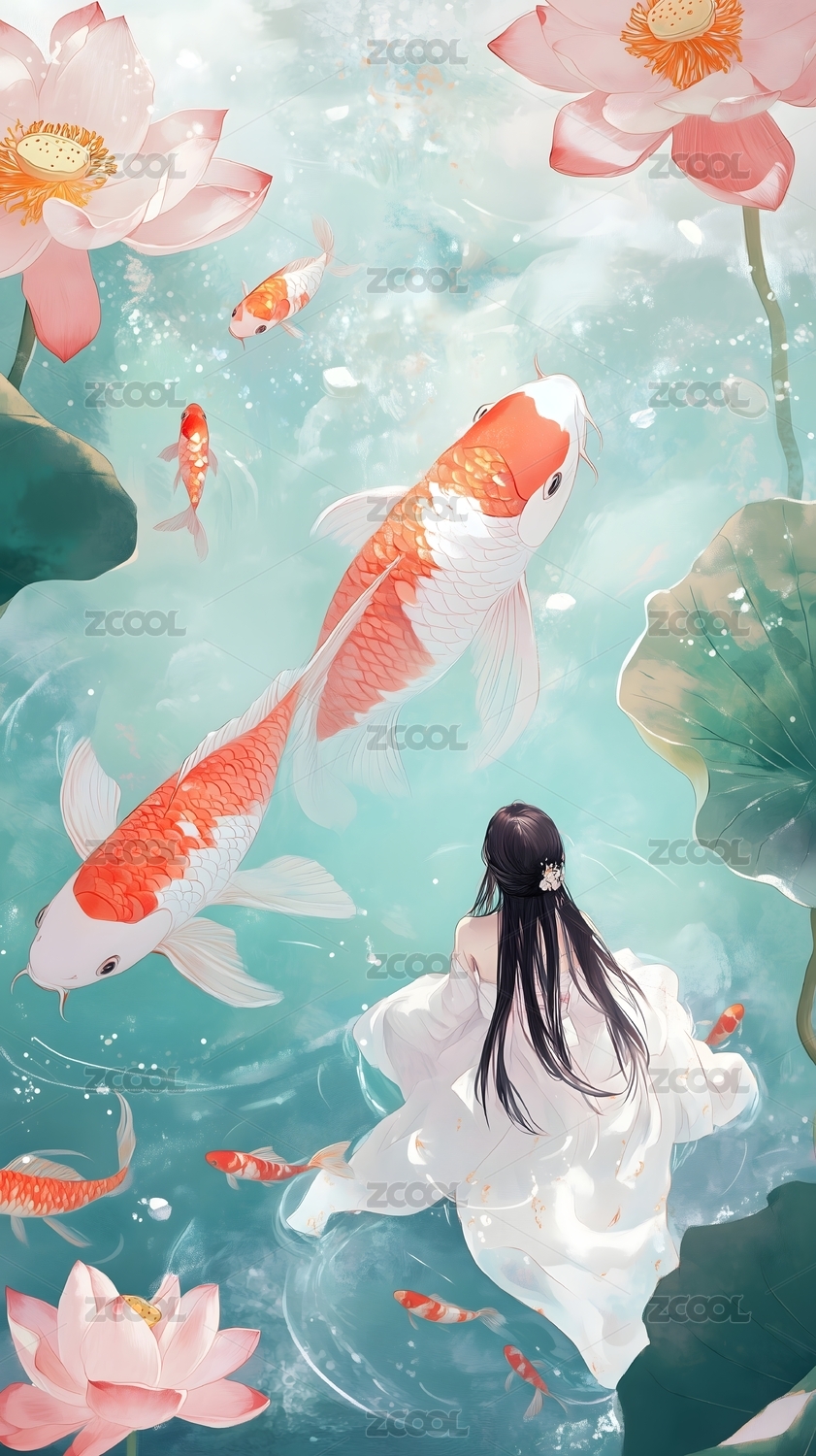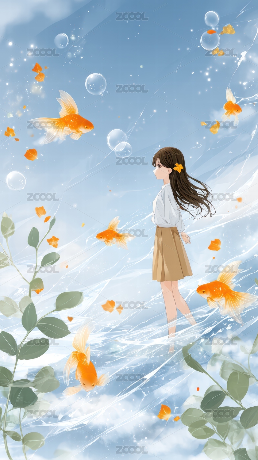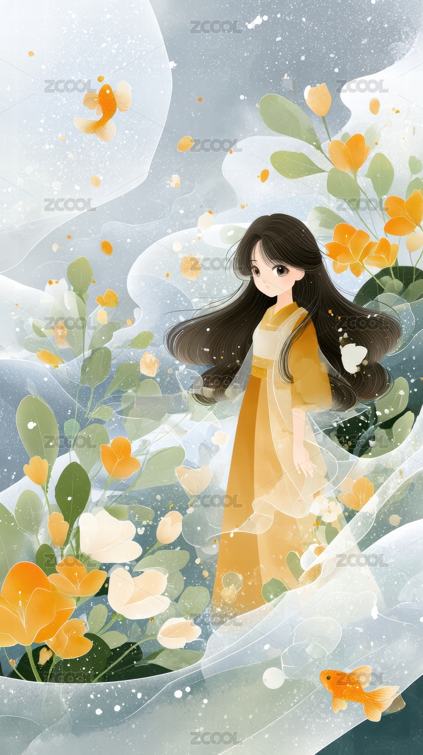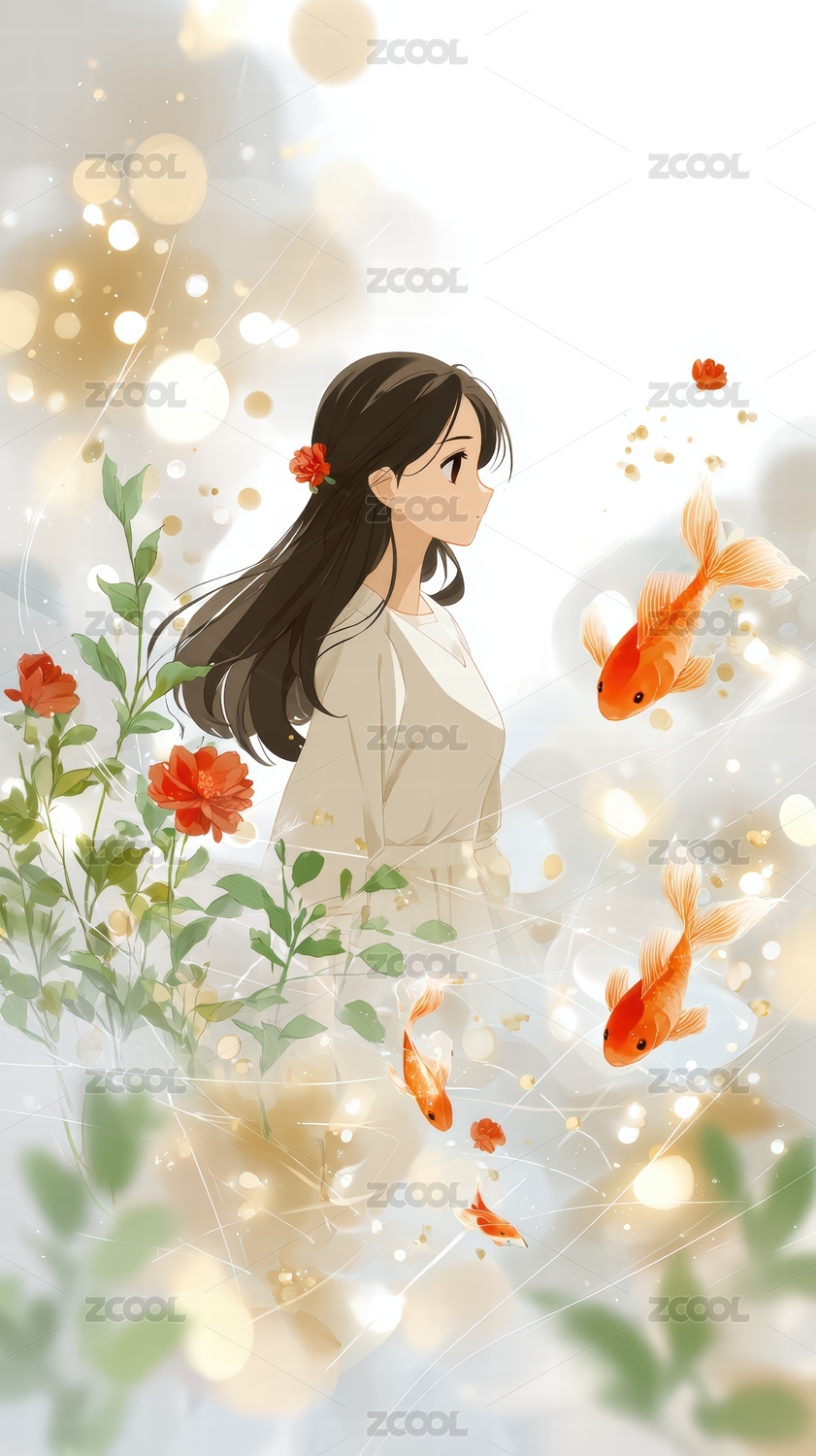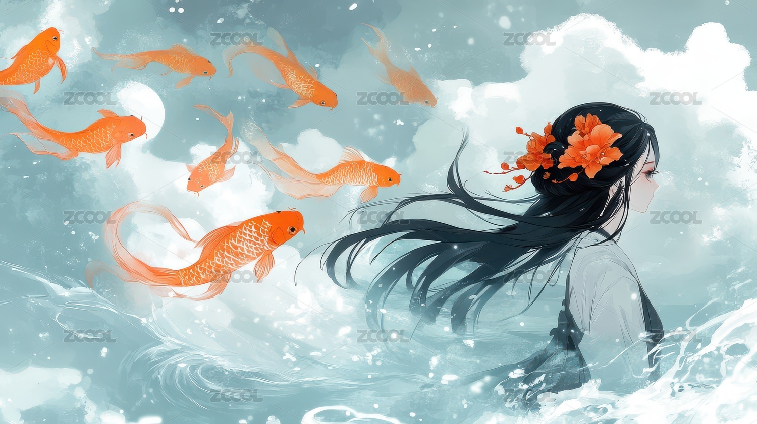 梦幻,花朵,白色,少女,海边,浪漫,金鱼,海浪,长发