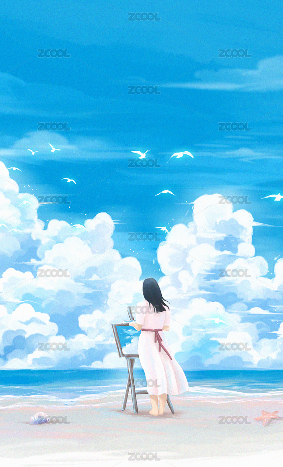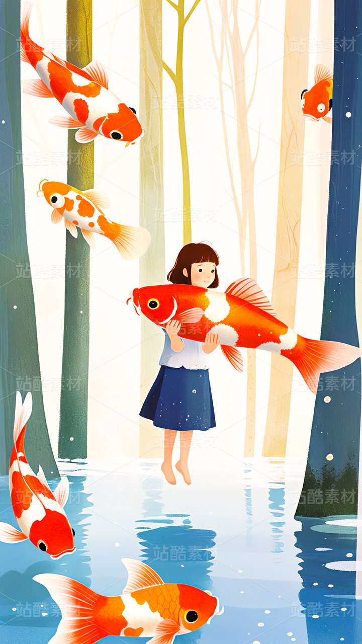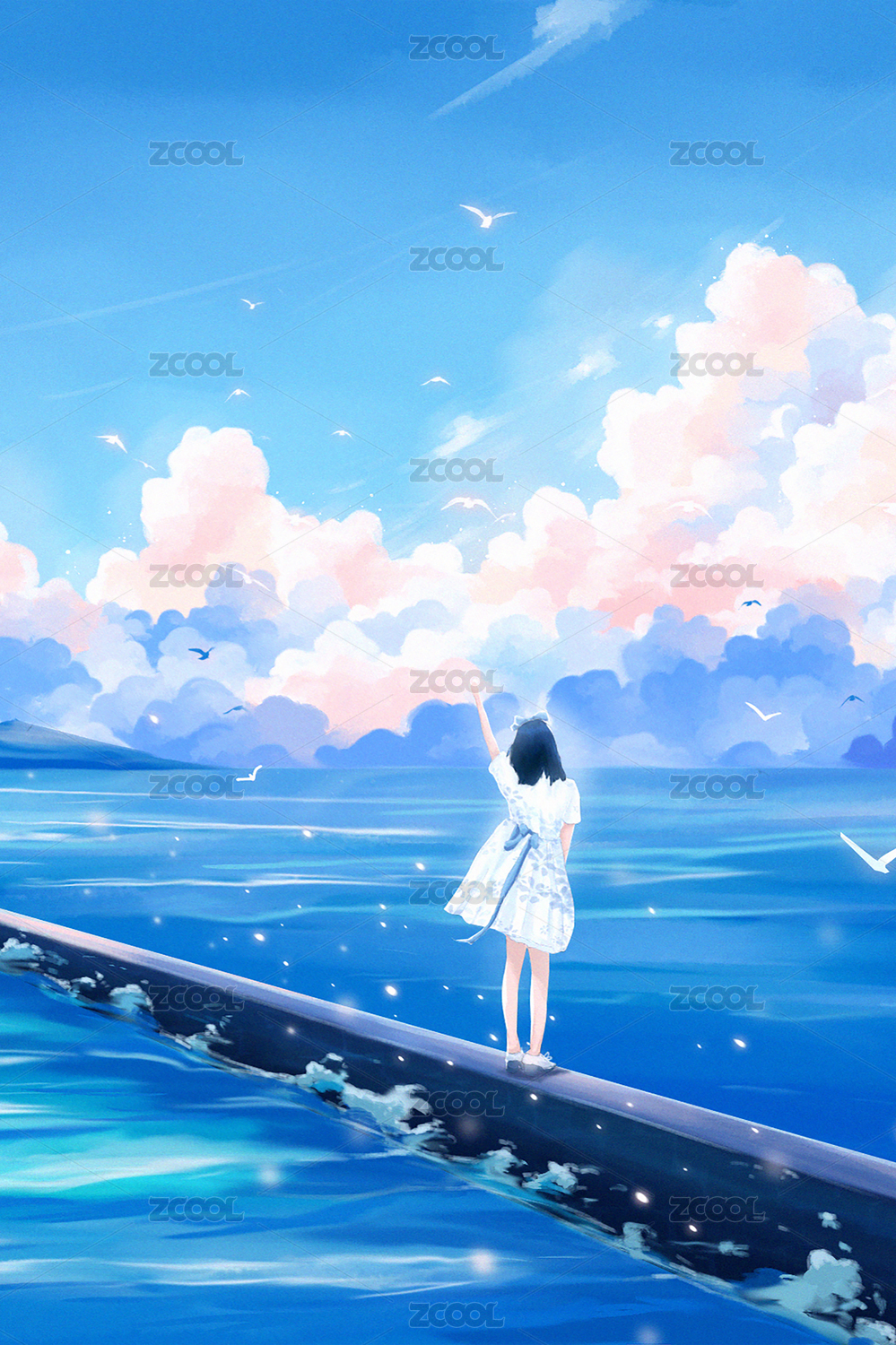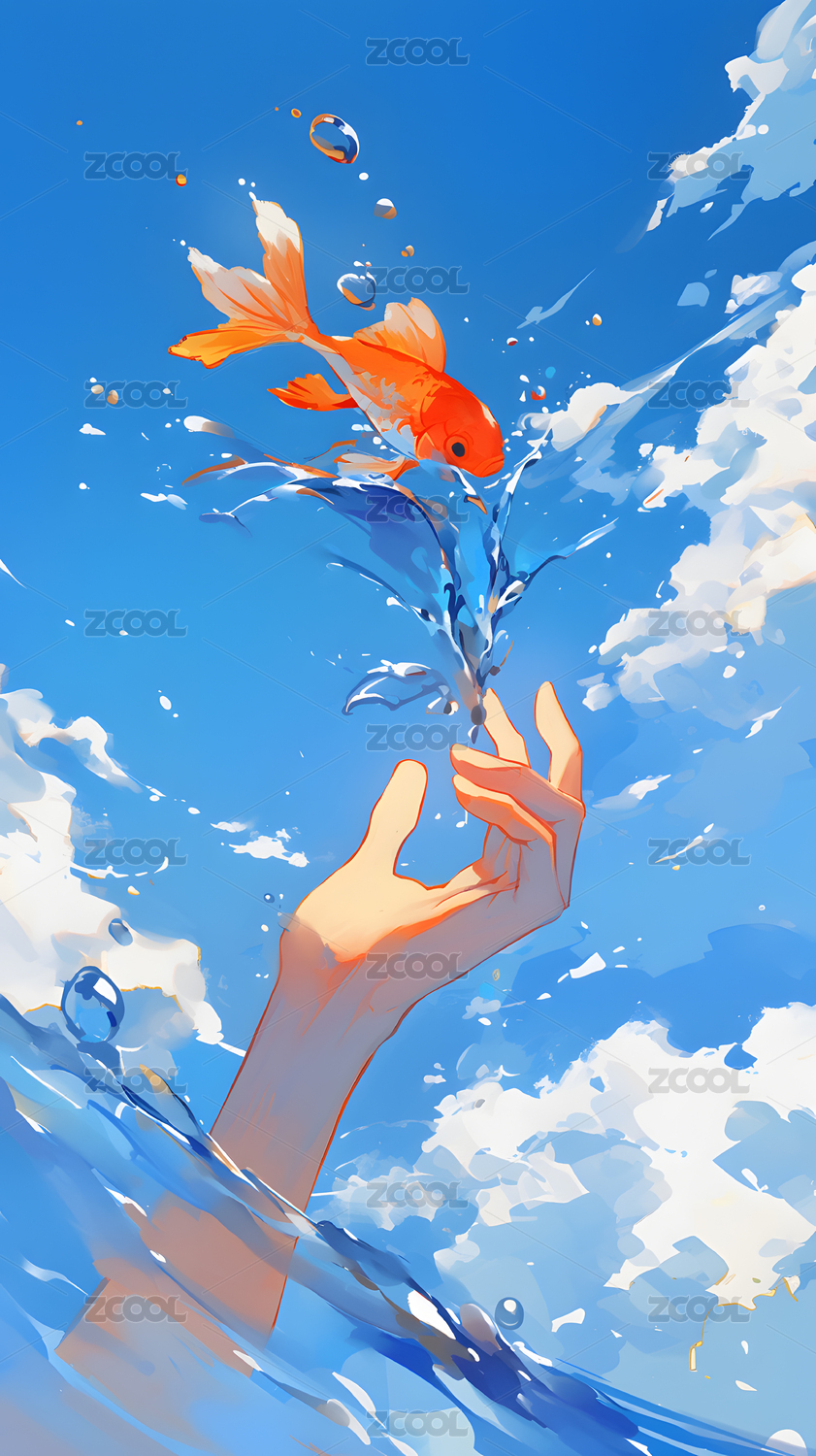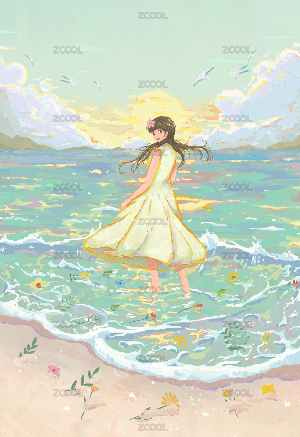 梦幻,花朵,白色,少女,海边,浪漫,金鱼,海浪,长发