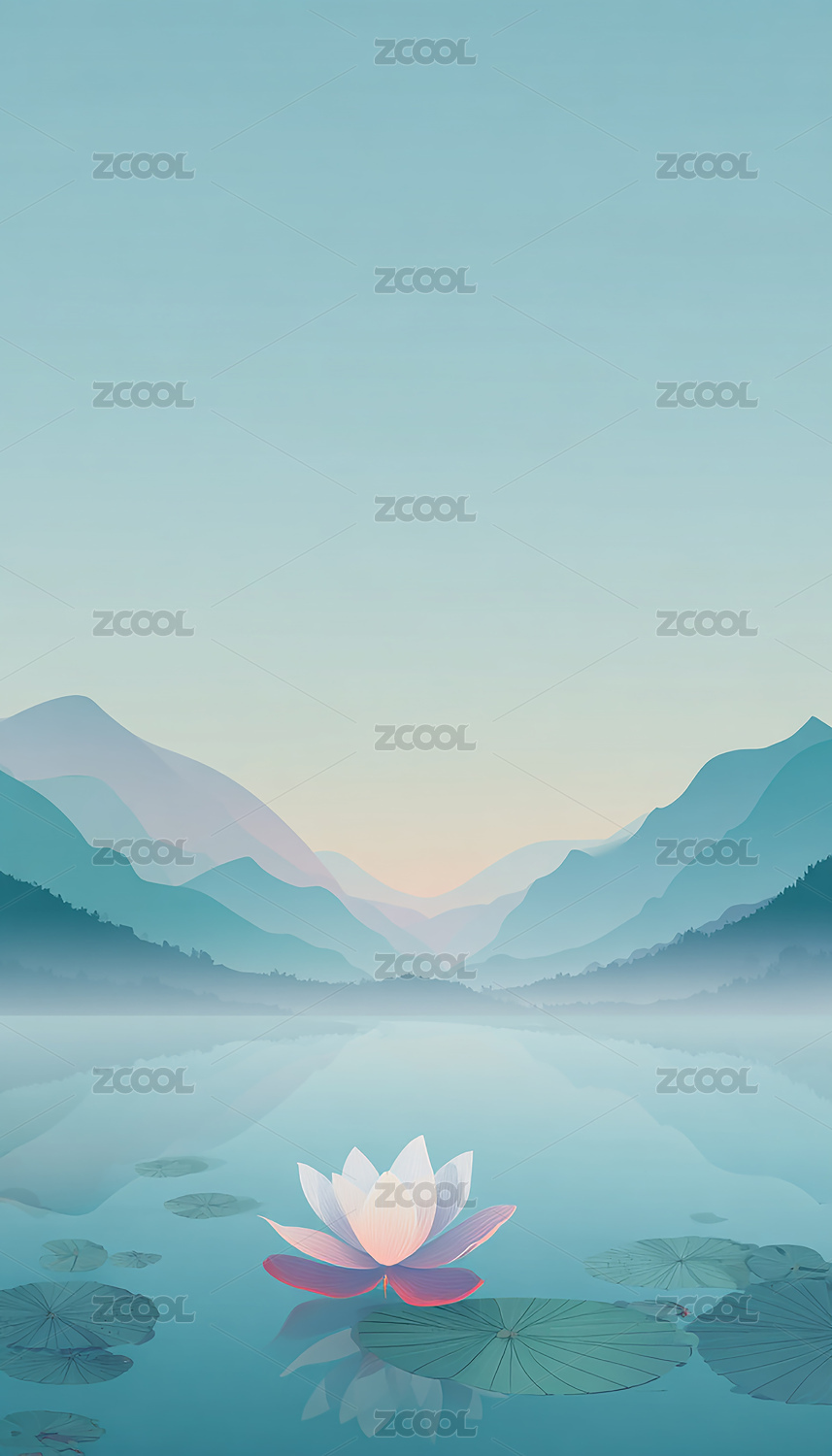中国风山水荷花荷叶船太阳月亮风景插画扁平