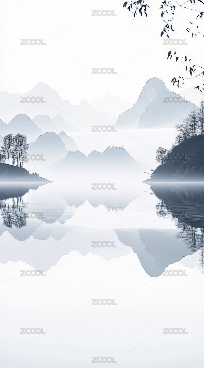 光影,湖水,倒影,亭台,山峦,晨曦,绿树,护栏