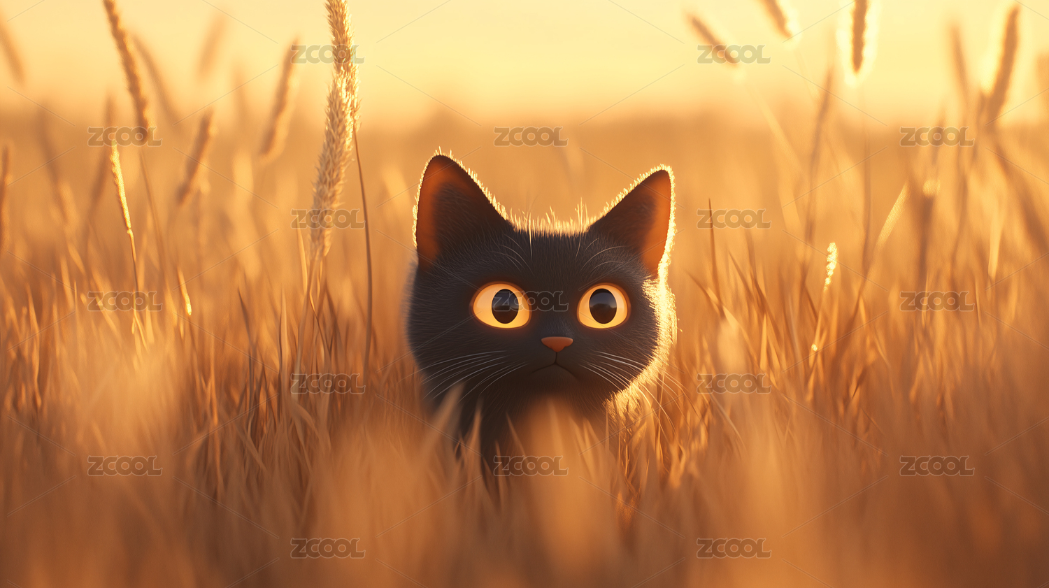 夜晚草地的羊毛毡毛绒猫咪3D卡通立体插画