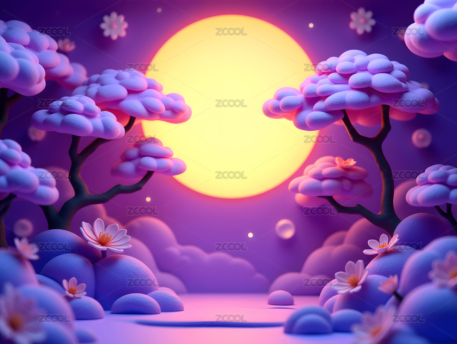 梦幻紫色日落与纸艺花树的场景插画