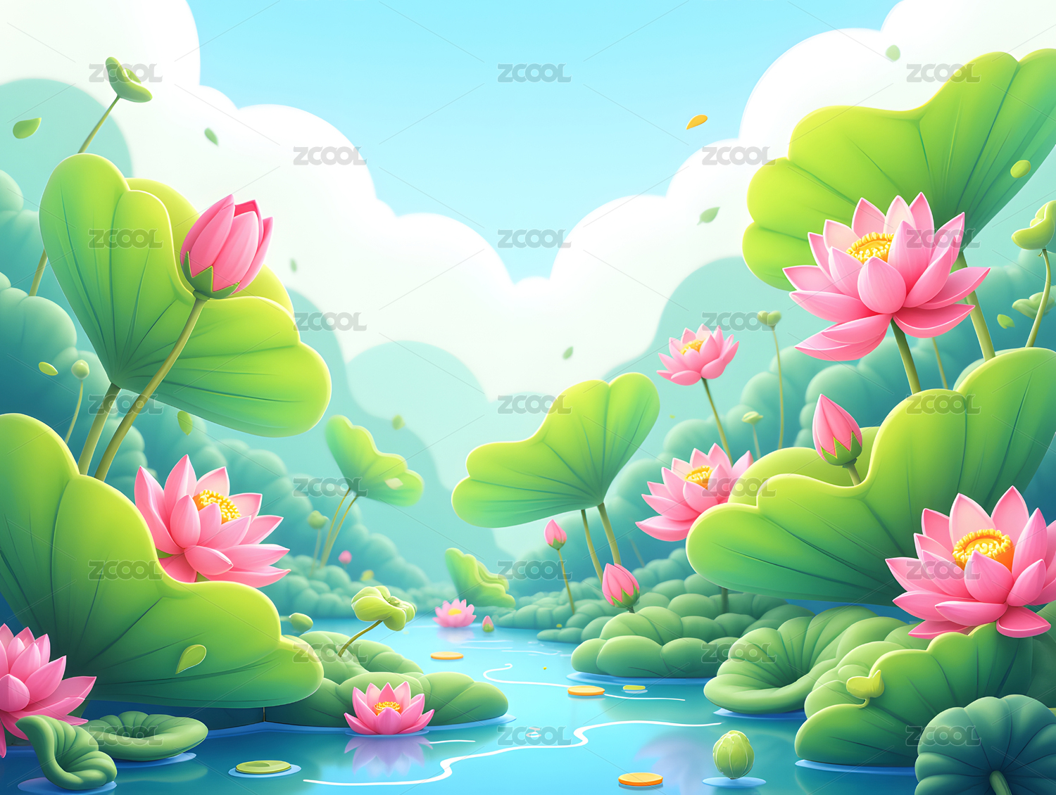 群山间的荷花水池插画