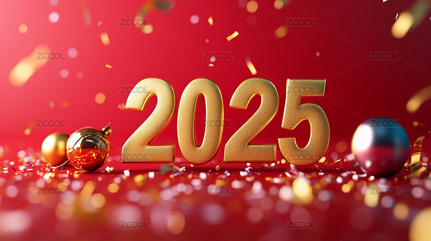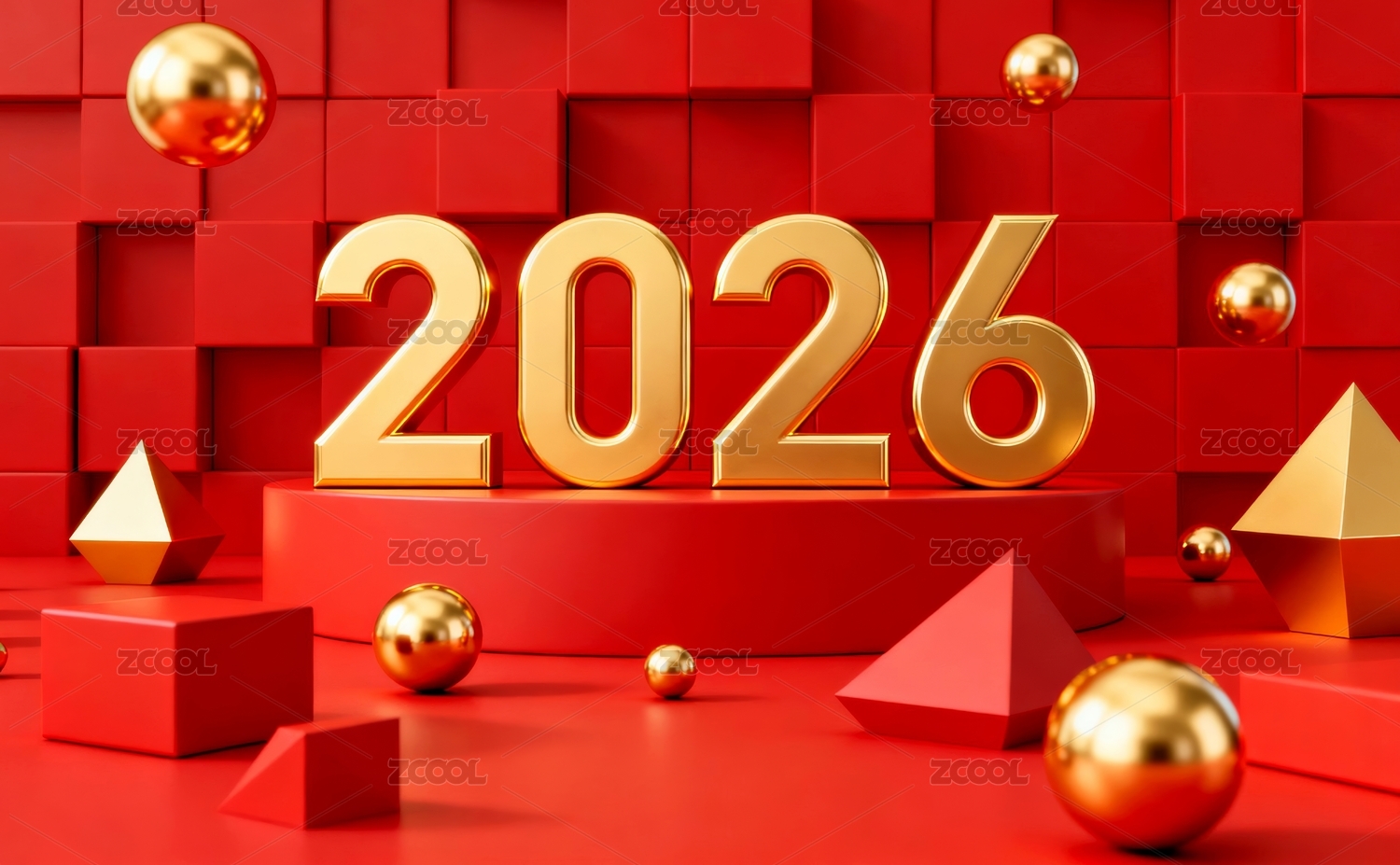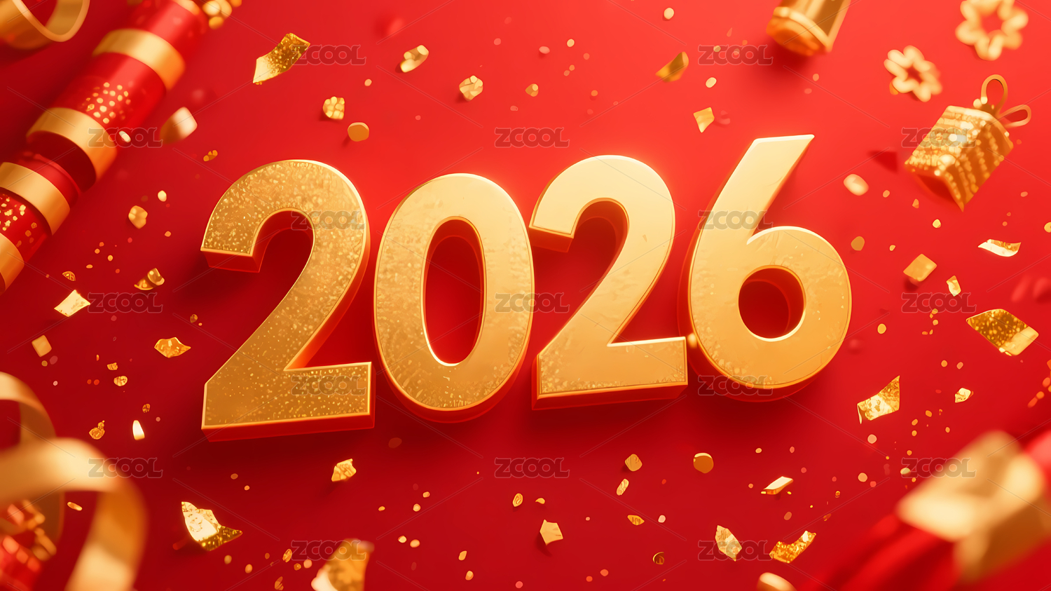 金色,红色,色调,氛围,2026,数字,喜庆,节日,丝带,装饰球