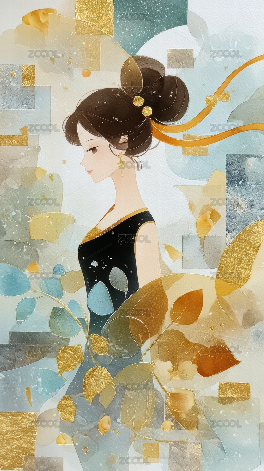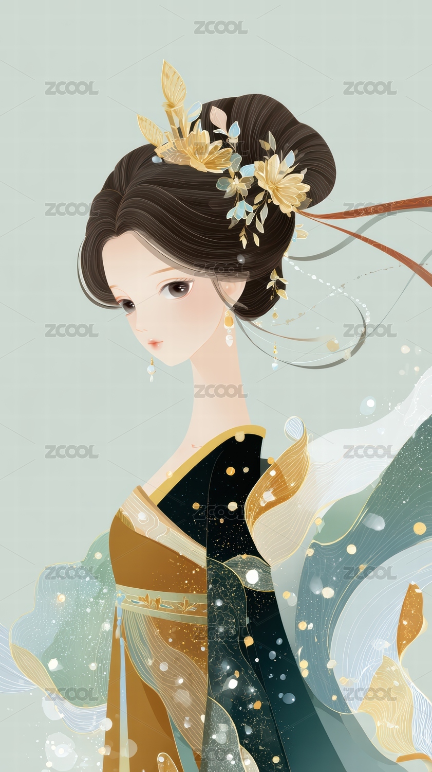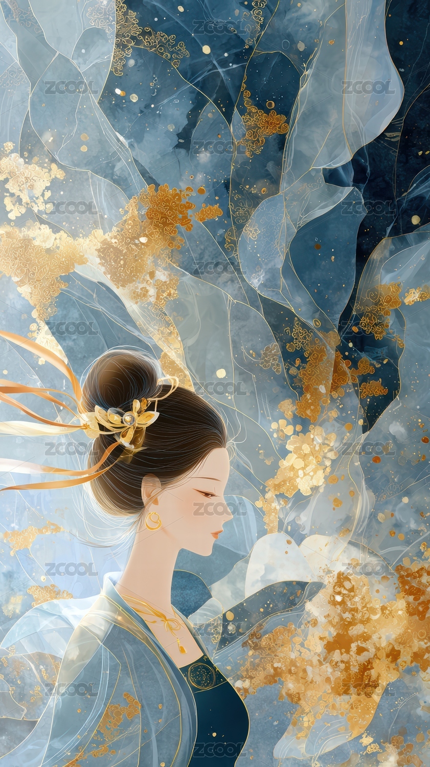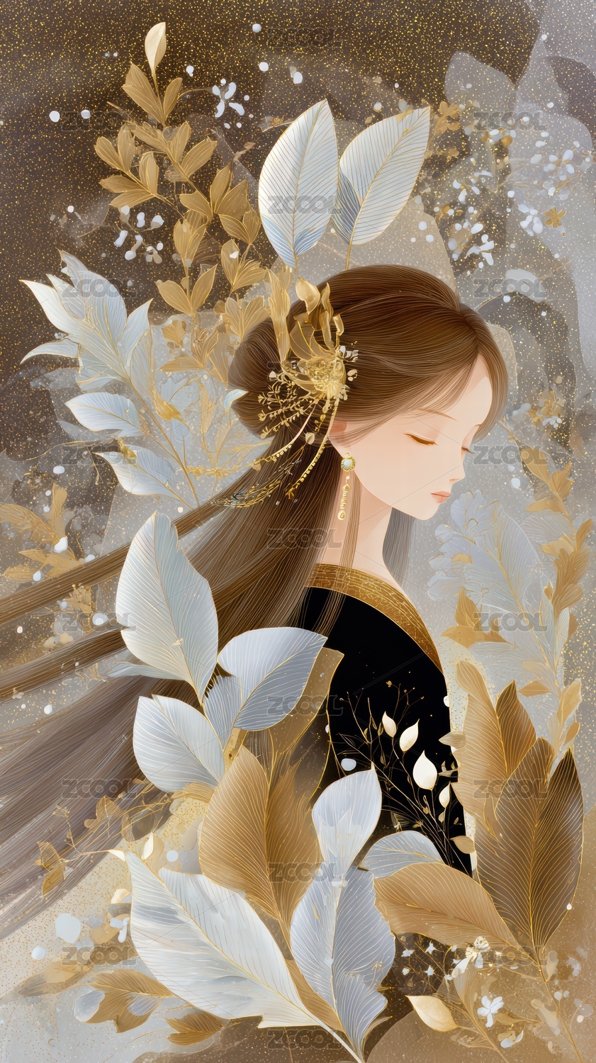 古典,背景,花朵,金箔,仕女,发饰,流苏,耳环,衣裳