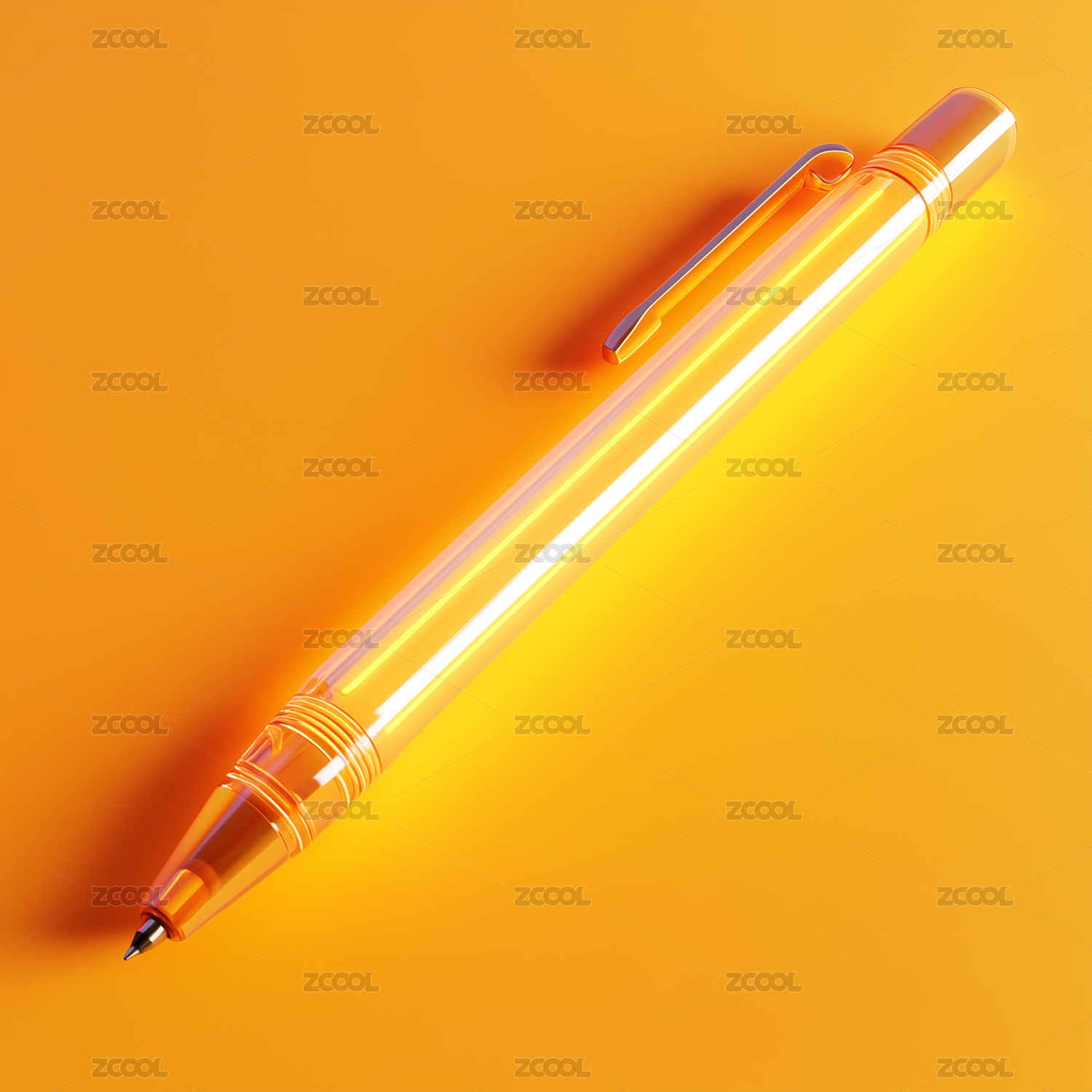 橙红色背景下的发着光芒的笔