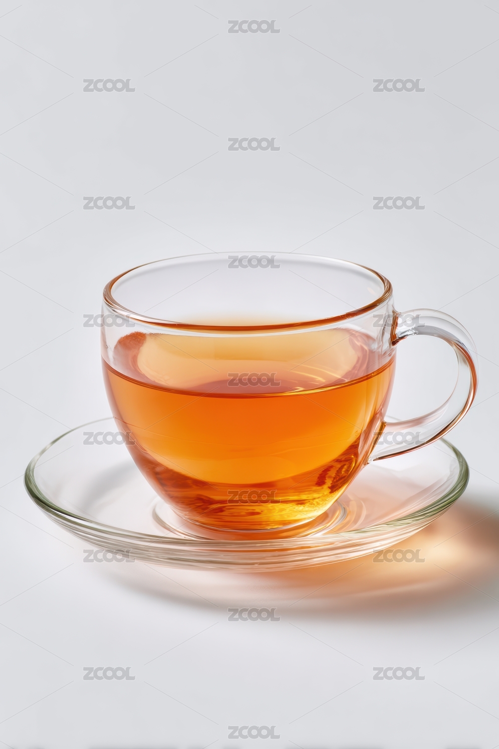 光影下玻璃杯配碟装茶色热饮桌面特写