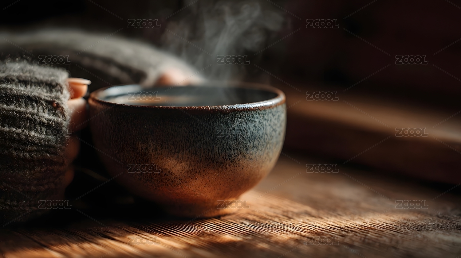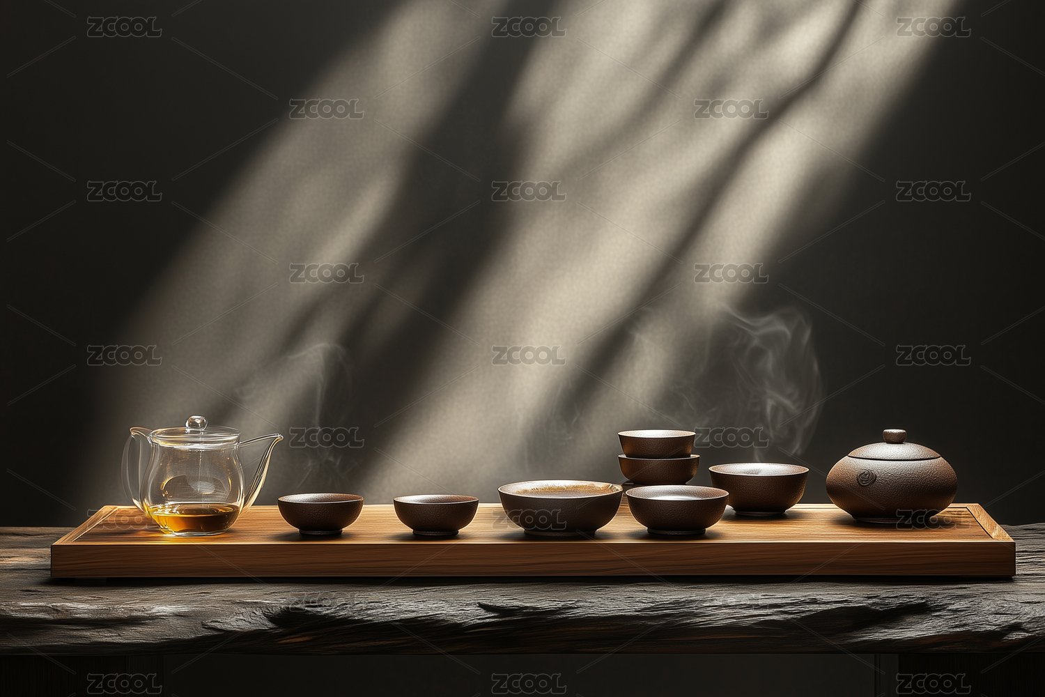 陶瓷茶具和袅袅飘散的沉香烟雾