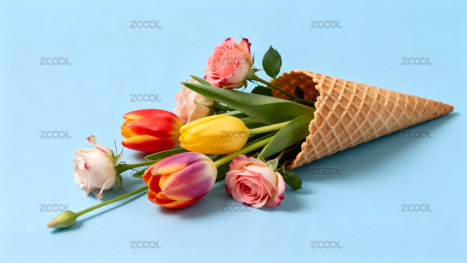 冰淇淋筒插满郁金香与玫瑰花束